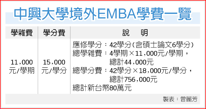 他強調,興大EMBA兩岸台商組是唯一在上海招生,2年學費約新台幣80萬元,畢業學分36學分,加上6個碩士論文學分,今年6月即將邁入第4屆。
