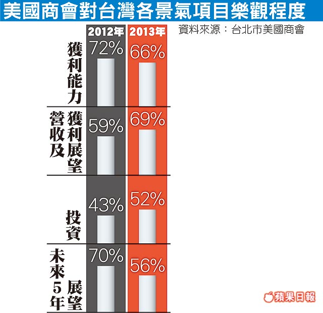 國 台北市美國商會昨發布今年商業景氣調查報告,近七成受訪企業認為,今年景氣較去年樂觀,但僅五成九受訪企業,對台灣未來五年的商業景氣感到樂觀,遠低於前年的八成及去年的七成。