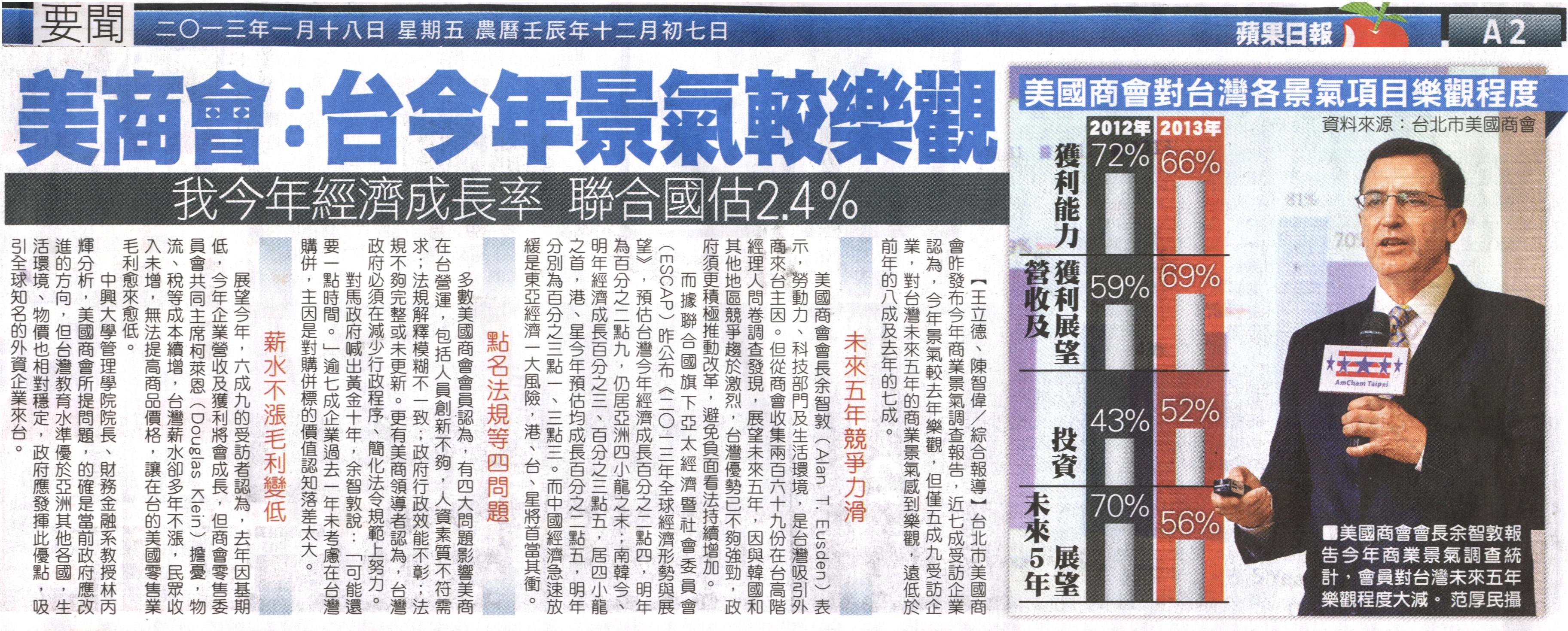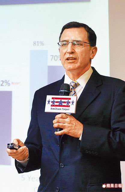 美國商會會長余智敦報告今年商業景氣調查統計,會員對台灣未來五年樂觀程度大減。范厚民攝