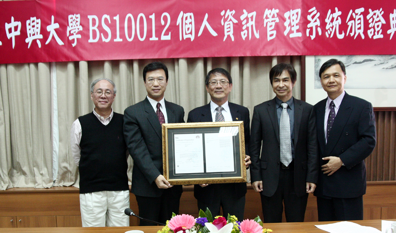 ![]() 英國標準協會蒲樹盛總經理(左)頒發BS10012認證給中興大學李德財校長 ![]() 左起為NII吳國維執行長、英國標準協會蒲樹盛總經理、中興大學李德財校長、林俊良副校長、計資中心呂瑞麟主任 |