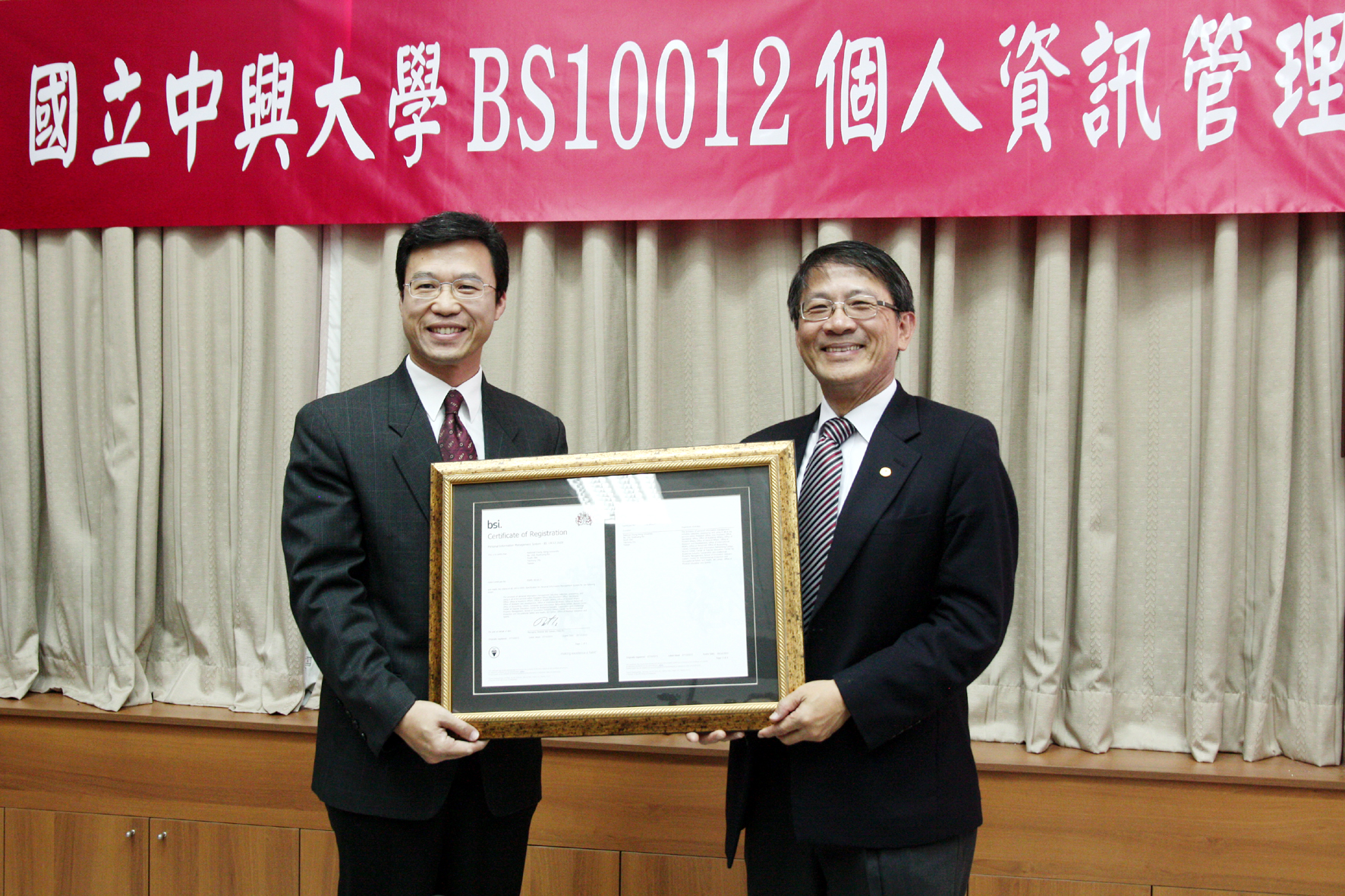 【圖文/媒體公關組】個人資料保護法去年10月正式上路,對於經常需要處理大批個人資料的公務機關與私人企業來說,都是相當大的考驗。國立中興大學早在去年3月即導入「個人資訊管理系統」(PIMS),同年12月27日取得英國標準協會BS10012的認證,成為國內第一個通過個資保護認證的大學。今日(23日)上午由英國標準協會蒲樹盛總經理蒞校頒發證書,興大李德財校長代表接受證書。