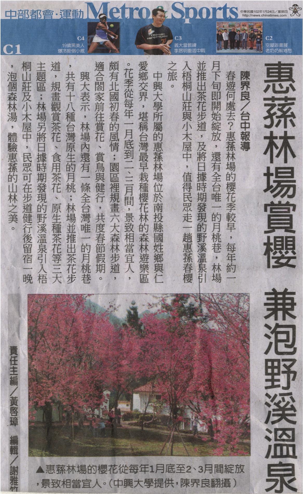 中興大學所屬的惠蓀林場位於南投縣國姓鄉與仁愛鄉交界,堪稱台 灣最早栽種櫻花林的森林遊樂區。花季從每年一月底到二、三月間, 景致相當宜人,頗有北國初春的風情;園區裡規畫六大森林步道,適 合閤家前往賞花、賞鳥與健行,共度春節假期。