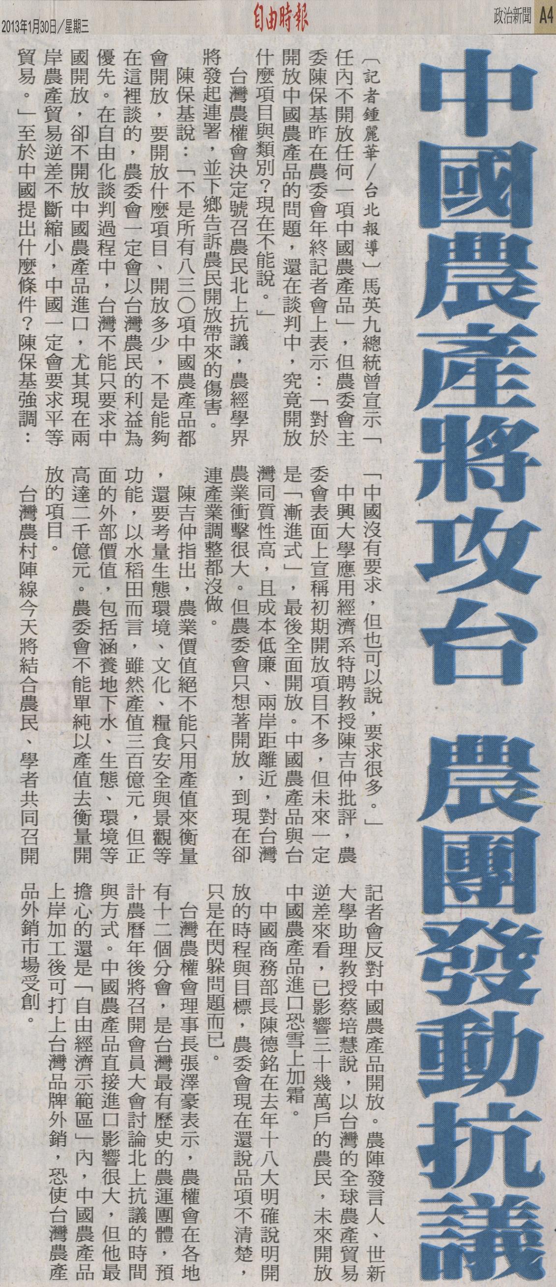 台灣農村陣線今天將結合農民、學者共同召開記者會反對中國農產品開放。農陣發言人、世新大學助理教授蔡培慧說,以台灣的全球農產貿易逆差來看,已影響三十幾萬戶的農民,未來開放中國農產品進口恐雪上加霜。