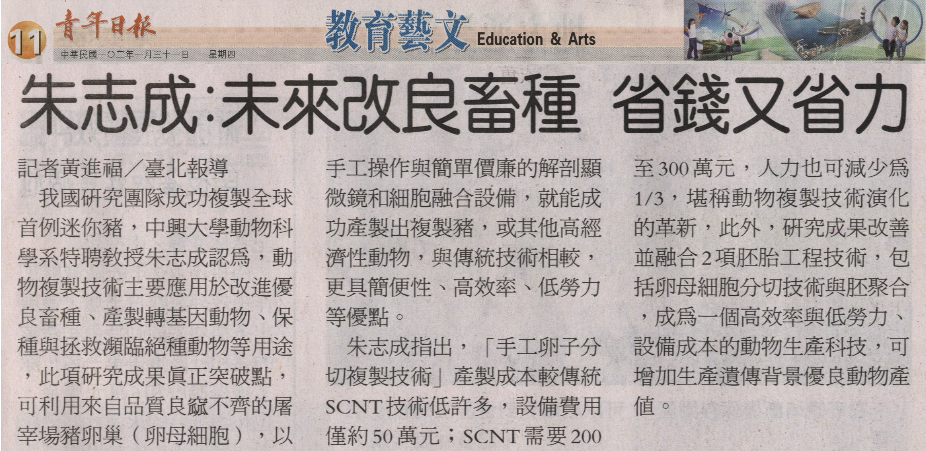 我國研究團隊成功複製全球首例迷你豬,中興大學動物科學系特聘教授朱志成認為,動物複製技術主要應用於改進優良畜種、產製轉基因動物、保種與拯救瀕臨絕種動物等用途,此項研究成果真正突破點,可利用來自品質良窳不齊的屠宰場豬卵巢(卵母細胞),以手工操作與簡單價廉的解剖顯微鏡和細胞融合設備,就能成功產製出複製豬,或其他高經濟性動物,與傳統技術相較,更具簡便性、高效率、低勞力等優點。