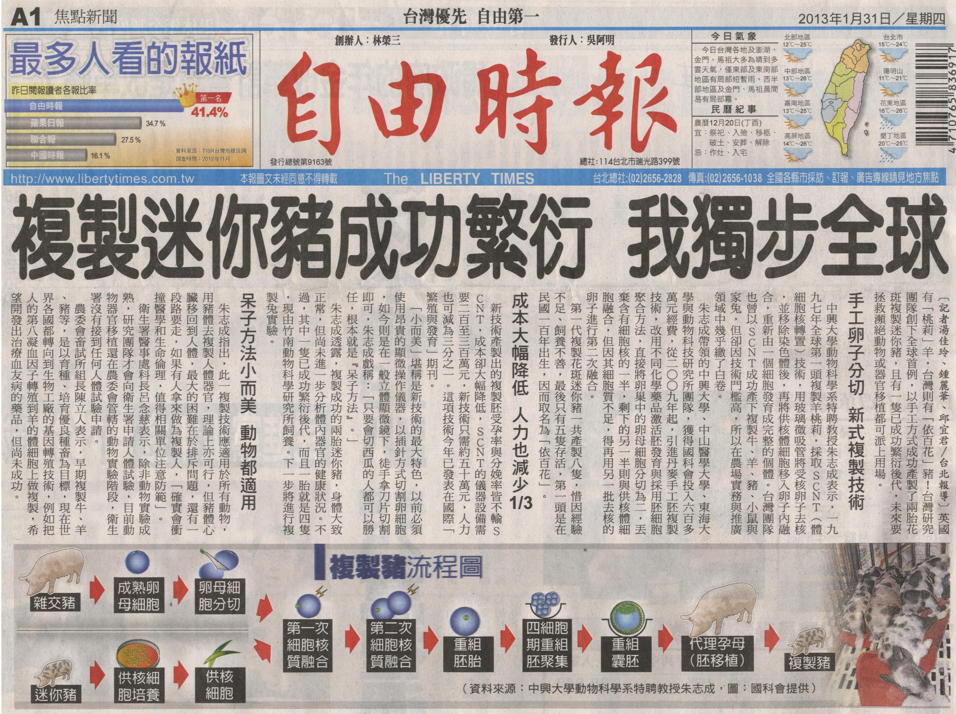 朱志成帶領的中興大學、中山醫學大學、東海大學與動物科技研究所團隊,獲得國科會投入六百多萬元經費,從二○○九年起,引進丹麥手工胚複製技術,改用不同化學藥品激活胚發育與採用胚細胞聚合方法,直接將卵巢中的卵母細胞分切為二,丟棄含有細胞核的一半,剩下的另一半則與供核體細胞融合,但因其細胞質不足,得再用另一批去核的卵子進行第二次融合。