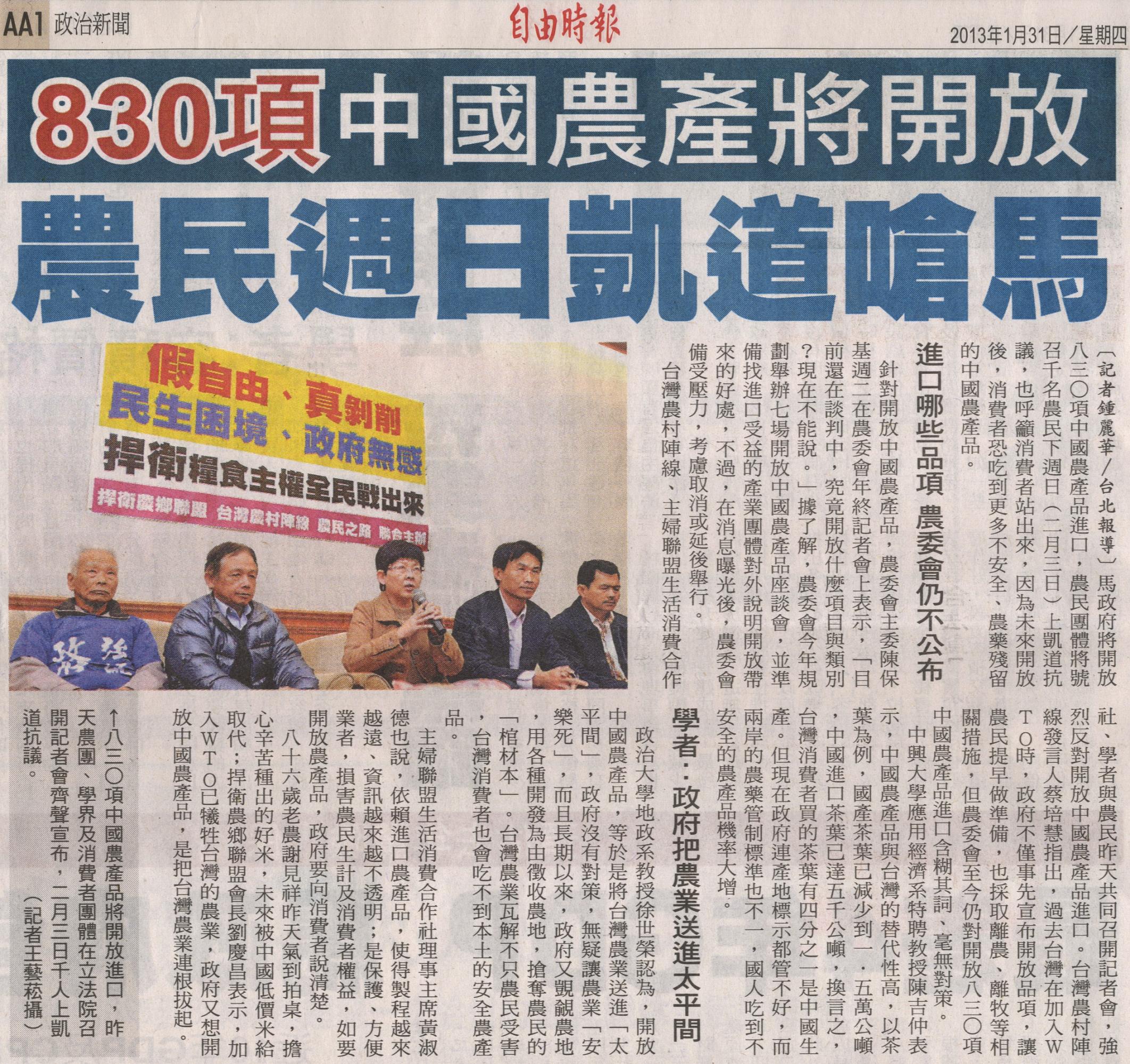 台灣農村陣線、主婦聯盟生活消費合作社、學者與農民昨天共同召開記者會,強烈反對開放中國農產品進口。台灣農村陣線發言人蔡培慧指出,過去台灣在加入WTO時,政府不僅事先宣布開放品項,讓農民提早做準備,也採取離農、離牧等相關措施,但農委會至今仍對開放八三○項中國農產品進口含糊其詞、毫無對策。