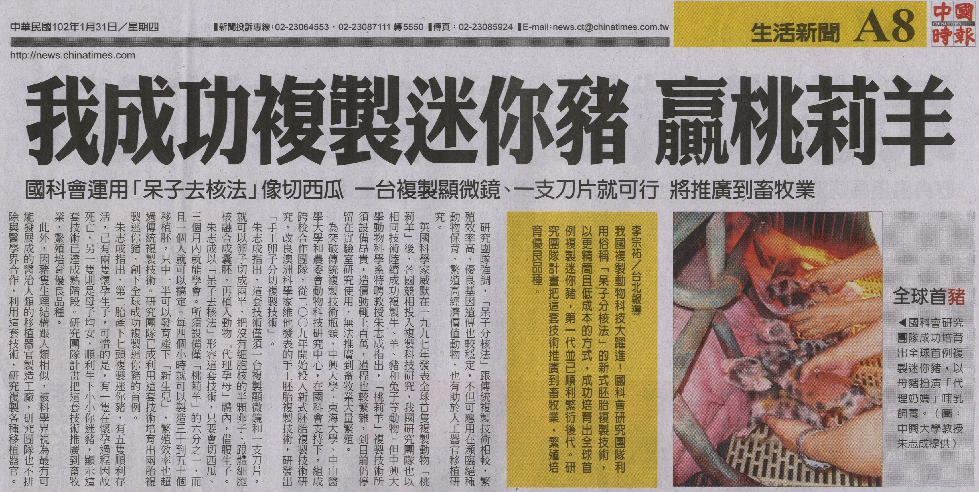我國複製動物科技大躍進!國科會研究團隊利用俗稱「呆子分核法」的新式胚胎複製技術,以更精簡且低成本的方式,成功培育出全球首例複製迷你豬,第一代並已順利繁衍後代。研究團隊計畫把這套技術推廣到畜牧業,繁殖培育優良品種。