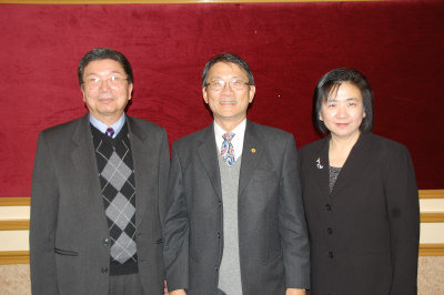 中興大學校長李德財(圖中)近期率團訪問加州,11日與南加校友聚會。圖左為校友徐新宏、右為校友會會長趙書琦。(記者陳慈暉/攝影) |