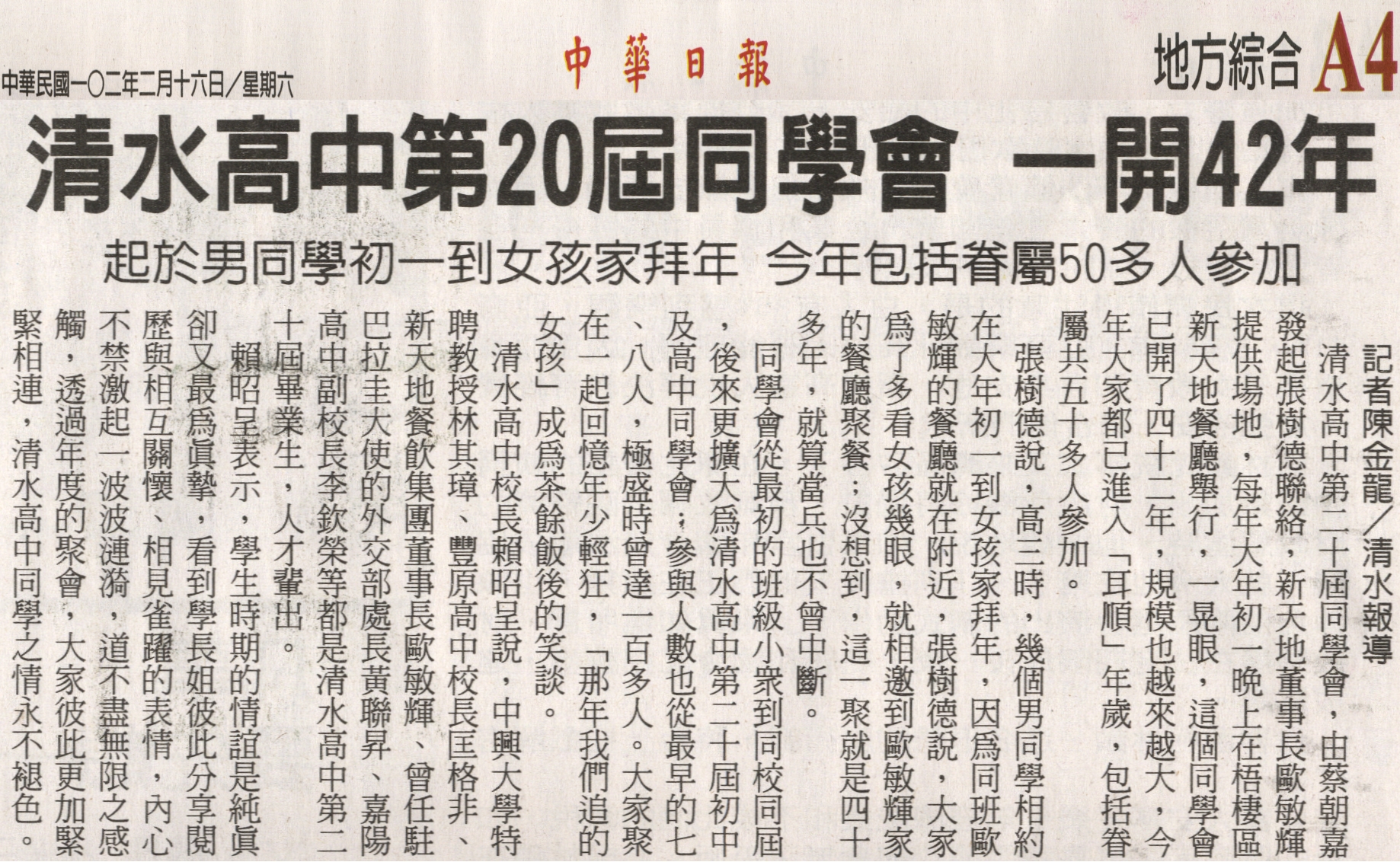 清水高中第二十屆同學會,由蔡朝嘉發起張樹德聯絡,新天地董事長歐敏輝提供場地,每年大年初一晚上在梧棲區新天地餐廳舉行,一晃眼,這個同學會已開了四十二年,規模也越來越大,今年大家都已進入「耳順」年歲,包括眷屬共五十多人參加。