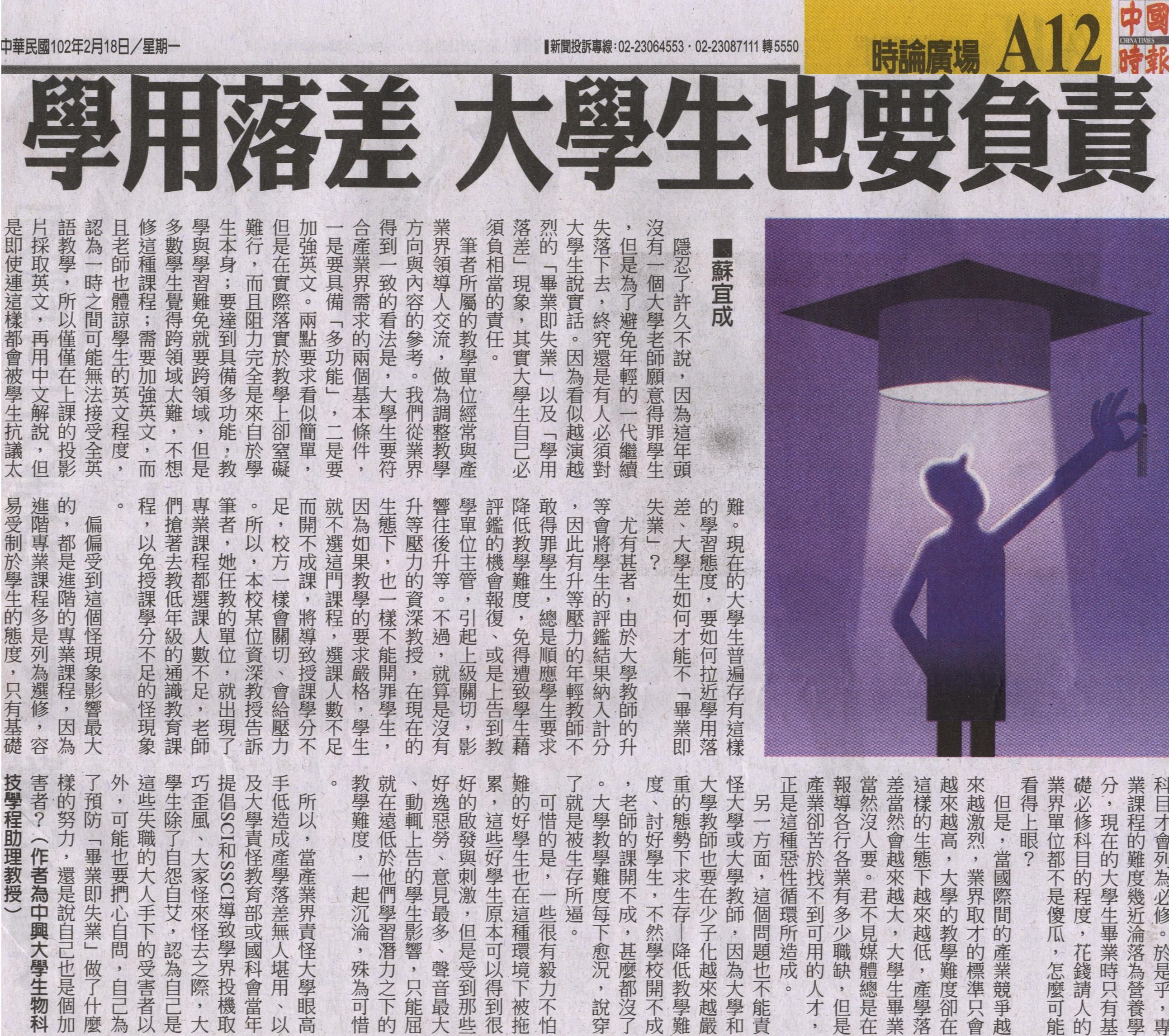 筆者所屬的教學單位經常與產業界領導人交流,做為調整教學方向與內容的參考。我們從業界得到一致的看法是,大學生要符合產業界需求的兩個基本條件,一是要具備「多功能」,二是要加強英文。兩點要求看似簡單,但是在實際落實於教學上卻窒礙難行,而且阻力完全是來自於學生本身;要達到具備多功能,教學與學習難免就要跨領域,但是多數學生覺得跨領域太難,不想修這種課程;需要加強英文,而且老師也體諒學生的英文程度,認為一時之間可能無法接受全英語教學,所以僅僅在上課的投影片採取英文,再用中文解說,但是即使連這樣都會被學生抗議太難。現在的大學生普遍存有這樣的學習態度,要如何拉近學用落差、大學生如何才能不「畢業即失業」?