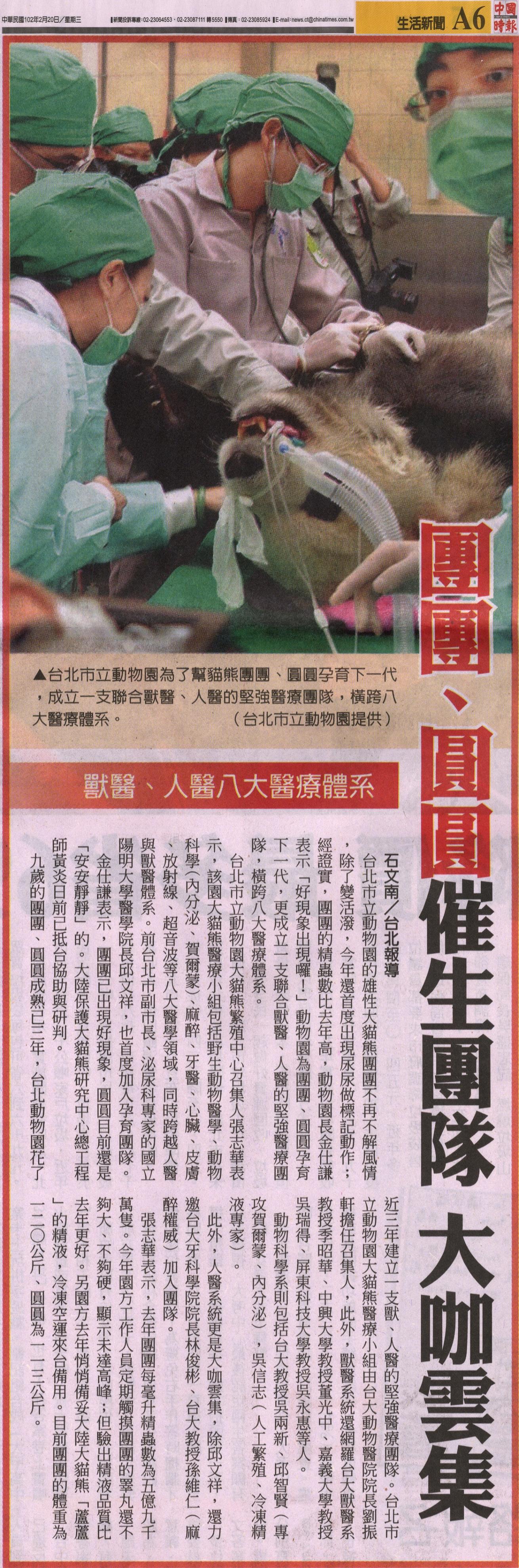 九歲的團團、圓圓成熟已三年,台北動物園花了近三年建立一支獸、人醫的堅強醫療團隊。台北市立動物園大貓熊醫療小組由台大動物醫院院長劉振軒擔任召集人,此外,獸醫系統還網羅台大獸醫系教授季昭華、中興大學教授董光中、嘉義大學教授吳瑞得、屏東科技大學教授吳永惠等人。