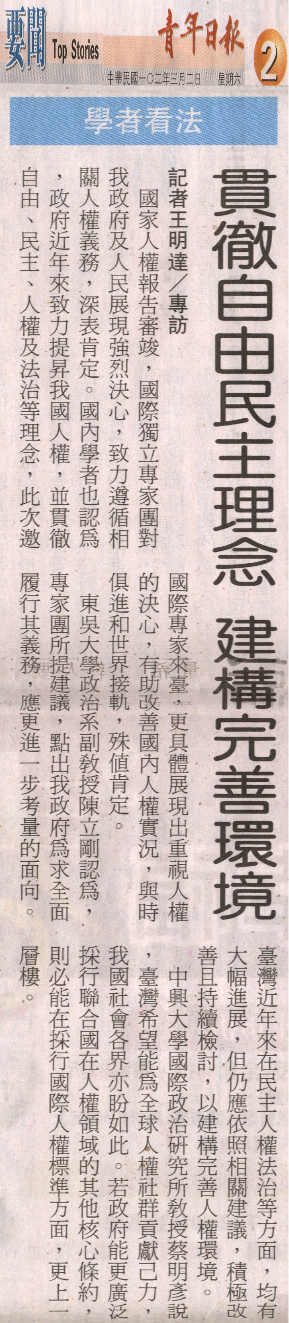 東吳大學政治系副教授陳立剛認為,專家團所提建議,點出我政府為求全面履行其義務,應更進一步考量的面向。臺灣近年來在民主人權法治等方面,均有大幅進展,但仍應依照相關建議,積極改善且持續檢討,以建構完善人權環境。
