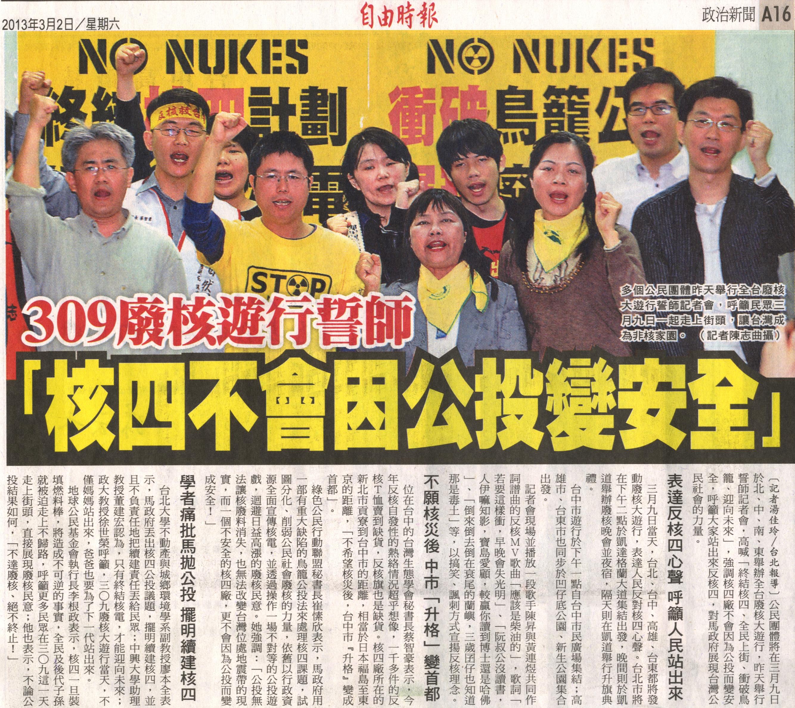 公民團體將在三月九日於北、中、南、東舉辦全台廢核大遊行,昨天舉行誓師記者會,高喊「終結核四、全民上街、衝破鳥籠、迎向未來」,強調核四廠不會因為公投而變安全,呼籲大家站出來反核四,對馬政府展現台灣公民社會的力量。