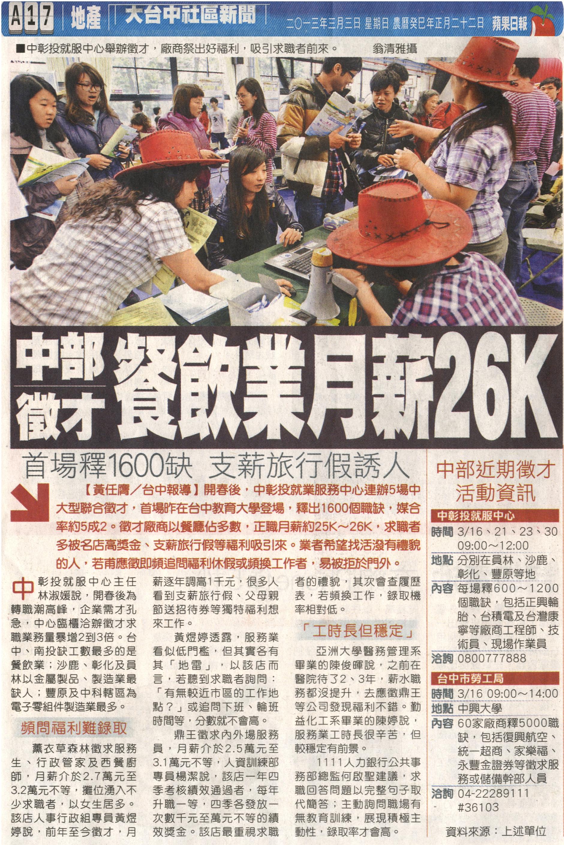 開春後,中彰投就業服務中心連辦5場中大型聯合徵才,首場昨在台中教育大學登場,釋出1600個職缺,媒合率約5成2。徵才廠商以餐廳佔多數,正職月薪約25K?26K,求職者多被名店高獎金、支薪旅行假等福利吸引來。業者希望找活潑有禮貌的人,若甫應徵即頻追問福利休假或頻換工作者,易被拒於門外。