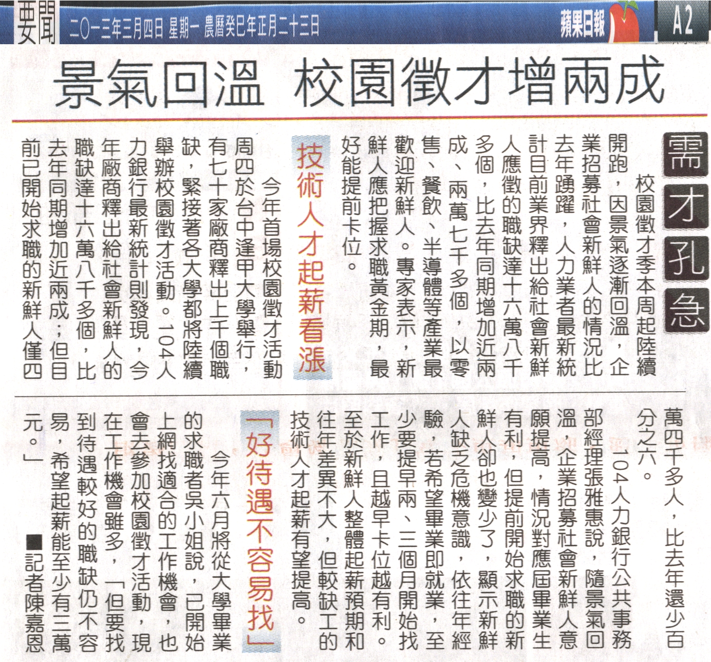 今年首場校園徵才活動周四於台中逢甲大學舉行,有七十家廠商釋出上千個職缺,緊接著各大學都將陸續舉辦校園徵才活動。104人力銀行最新統計則發現,今年廠商釋出給社會新鮮人的職缺達十六萬八千多個,比去年同期增加近兩成;但目前已開始求職的新鮮人僅四萬四千多人,比去年還少百分之六。