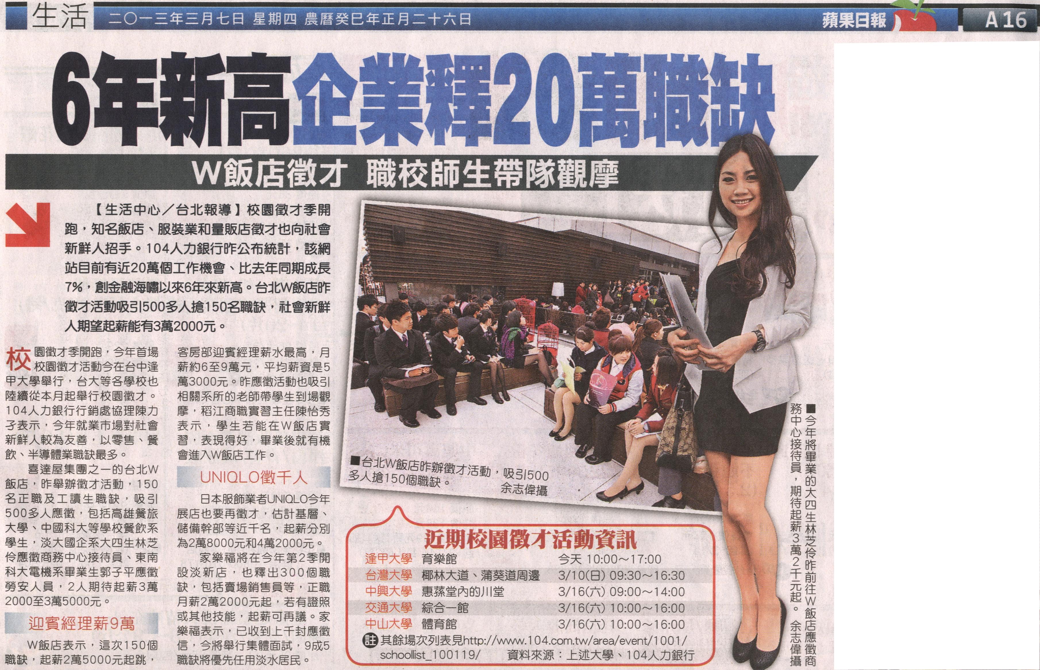 校園徵才季開跑,知名飯店、服裝業和量販店徵才也向社會新鮮人招手。104人力銀行昨公布統計,該網站目前有近20萬個工作機會、比去年同期成長7%,創金融海嘯以來6年來新高。台北W飯店昨徵才活動吸引500多人搶150名職缺,社會新鮮人期望起薪能有3萬2000元。