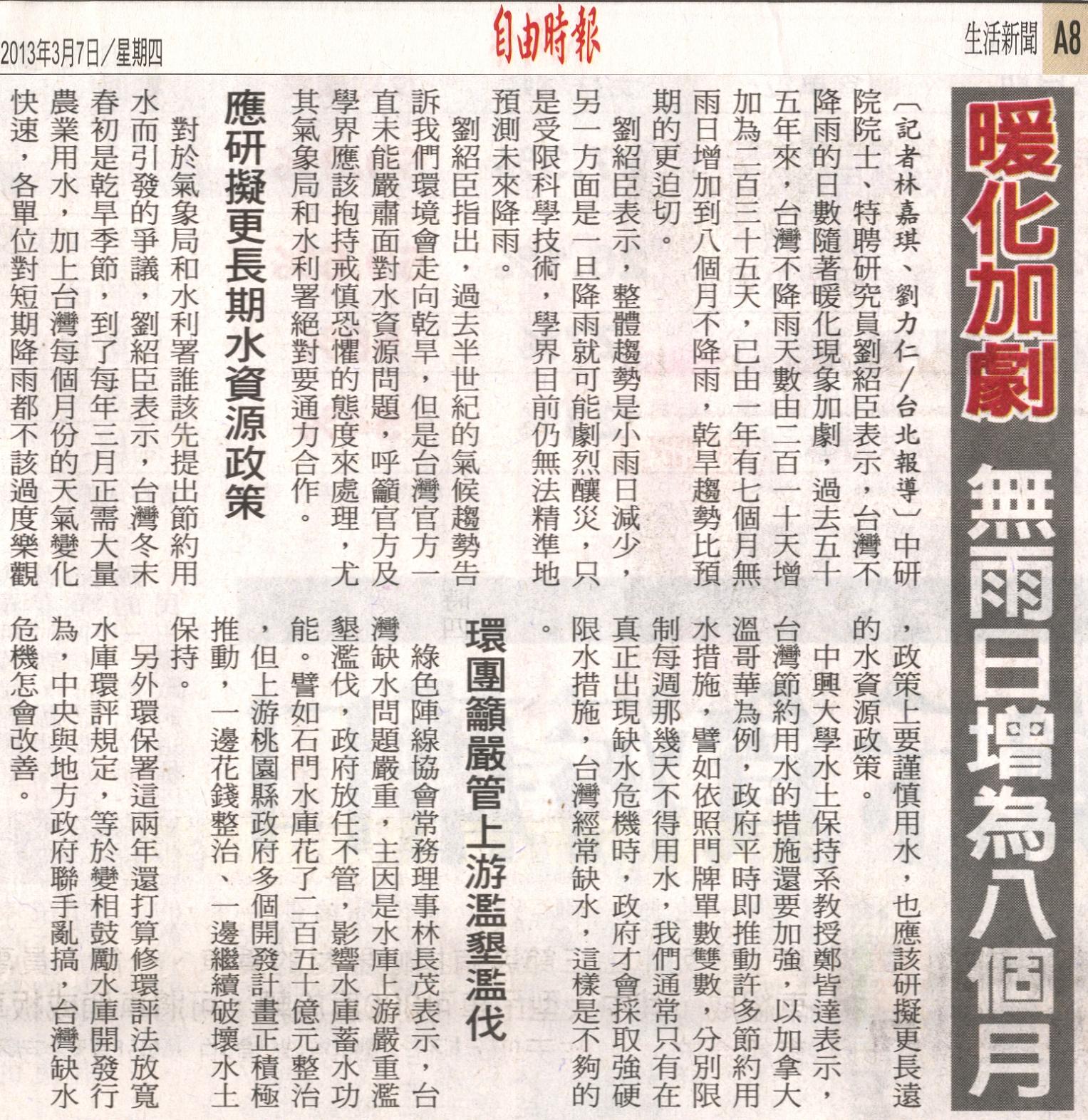 中研院院士、特聘研究員劉紹臣表示,台灣不降雨的日數隨著暖化現象加劇,過去五十五年來,台灣不降雨天數由二百一十天增加為二百三十五天,已由一年有七個月無雨日增加到八個月不降雨,乾旱趨勢比預期的更迫切。