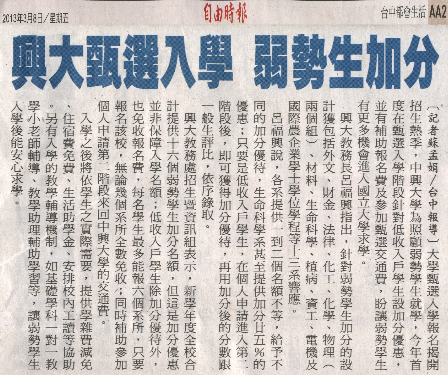 興大教務長呂福興指出,針對弱勢學生加分的設計獲包括外文、財金、法律、化工、化學、物理(兩個組)、材料、生命科學、植病、資工、電機及國際農企業學士學位學程等十三系響應。