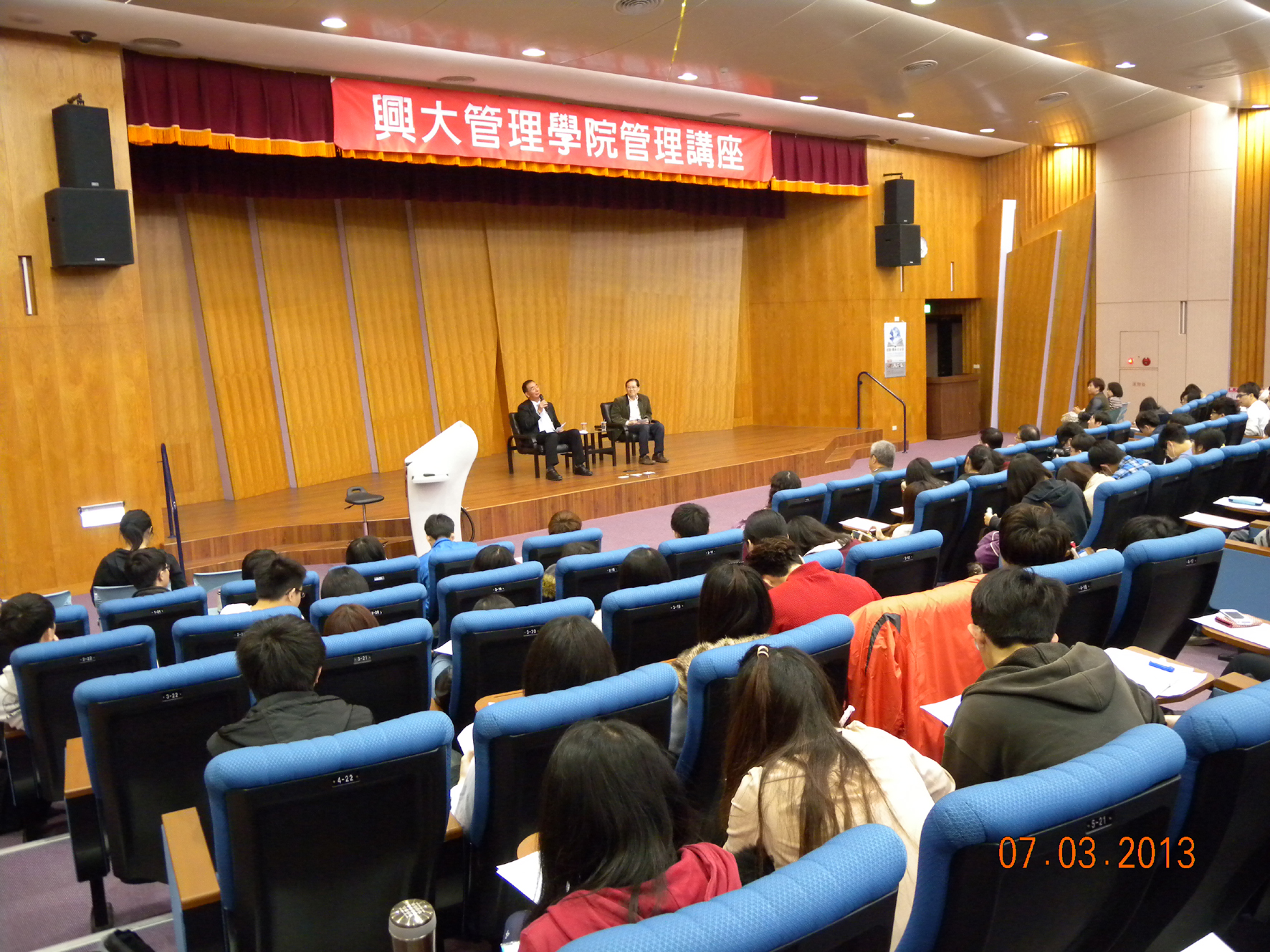 興大管理講座由管理學院開設,全校共有320位學生選修,每週三小時的課程,邀請國內成功企業家與專業經理人現身說法,時間為每週四下午2:10-5:00,歡迎各界踴躍旁聽。