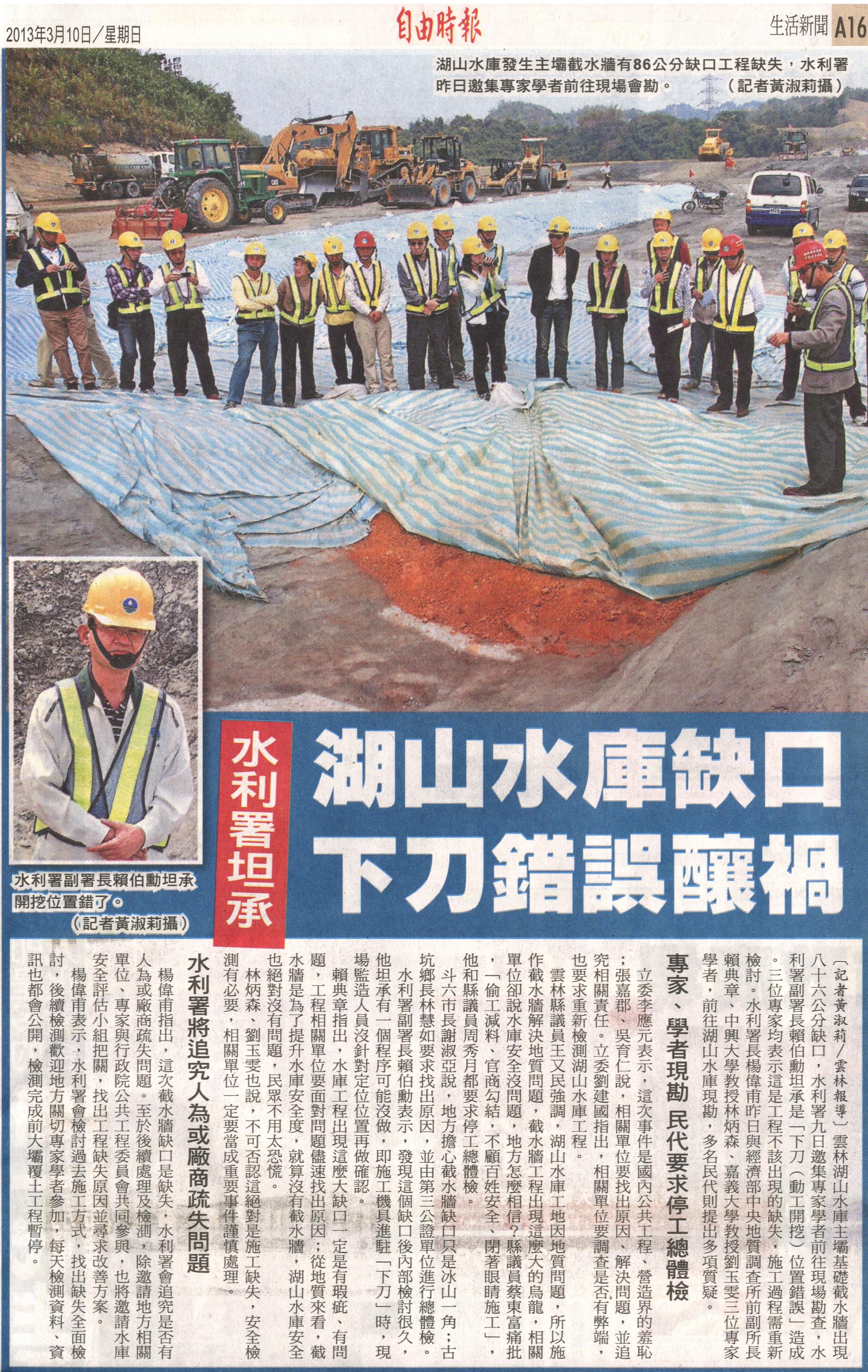 雲林湖山水庫主壩基礎截水牆出現八十六公分缺口,水利署九日邀集專家學者前往現場勘查,水利署副署長賴伯勳坦承是「下刀(動工開挖)位置錯誤」造成。三位專家均表示這是工程不該出現的缺失,施工過程需重新檢討。水利署長楊偉甫昨日與經濟部中央地質調查所前副所長賴典章、中興大學教授林炳森、嘉義大學教授劉玉雯三位專家學者,前往湖山水庫現勘,多名民代則提出多項質疑。
