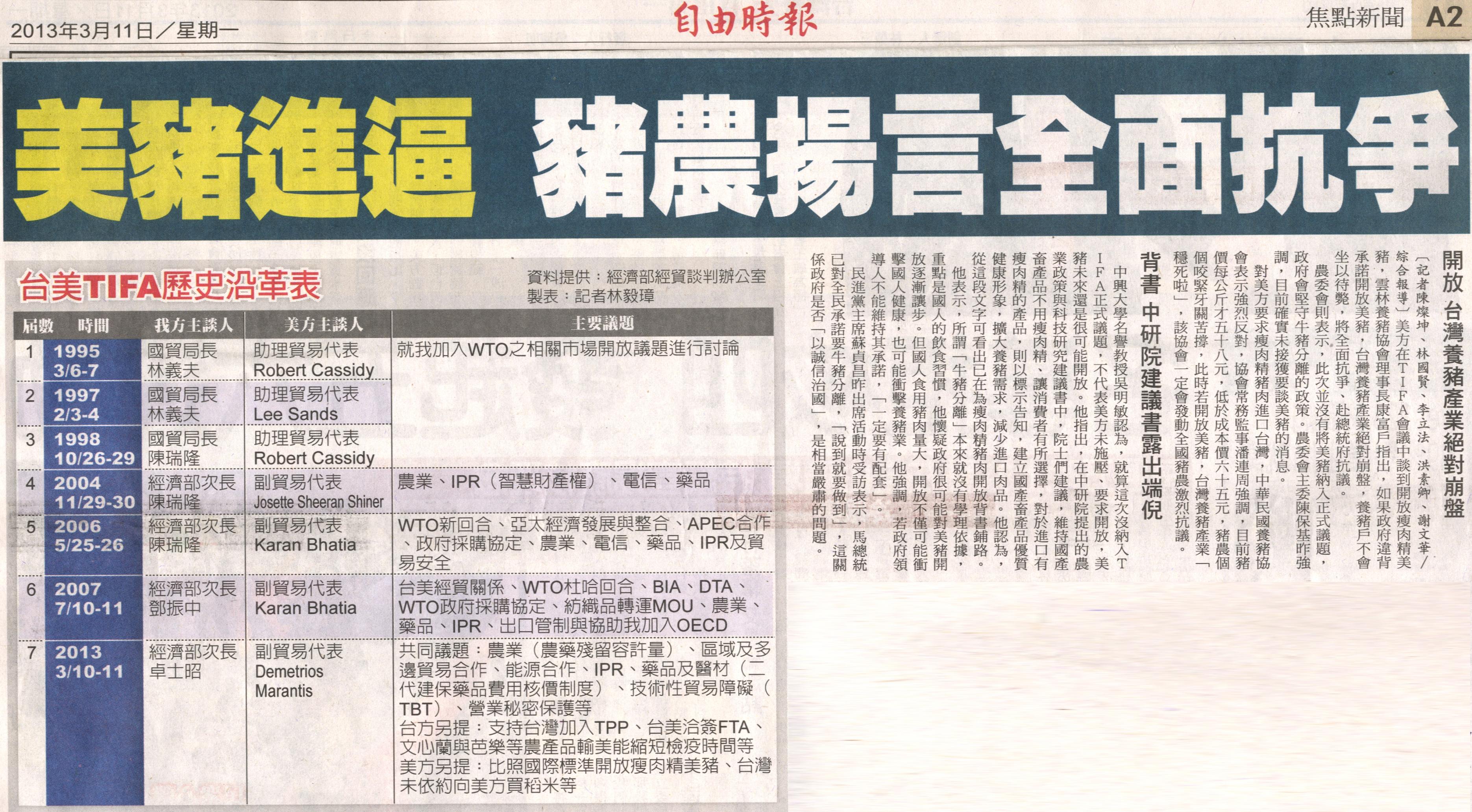 國 美方在TIFA會議中談到開放瘦肉精美豬,雲林養豬協會理事長康富戶指出,如果政府違背承諾開放美豬,台灣養豬產業絕對崩盤,養豬戶不會坐以待斃,將全面抗爭、赴總統府抗議。