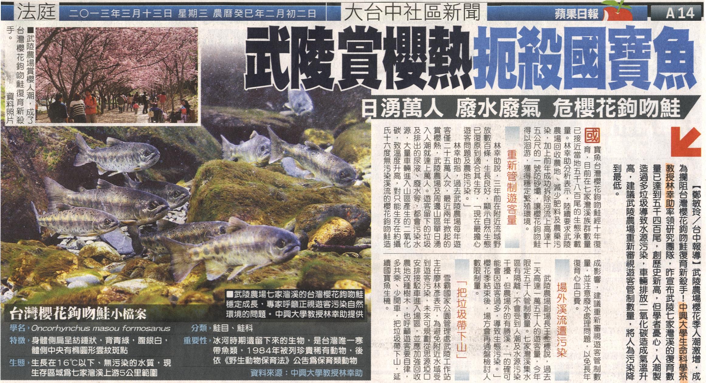 武陵農場櫻花季人潮激增,成為攔阻台灣櫻花鉤吻鮭復育新殺手!中興大學生命科學系教授林幸助率領研究團隊,昨宣布武陵七家灣溪的復育數量已達到五千四百尾,創歷史新高,但學者憂心,人潮製造過多垃圾導致水源污染,車輛排放二氧化碳造成氣溫升高,建議武陵農場重新審視遊客管制數量,將人為污染降到最低。