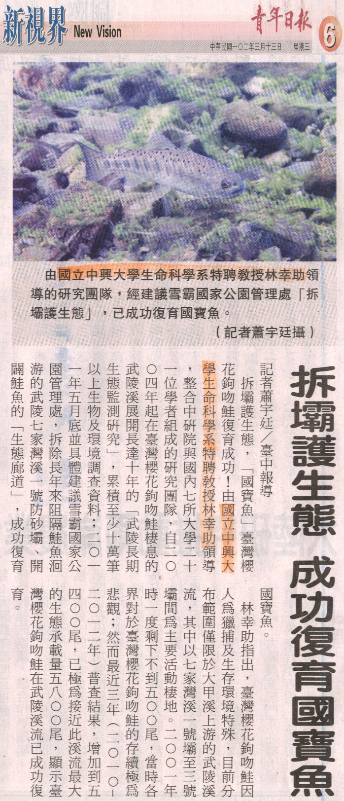拆壩護生態,「國寶魚」臺灣櫻花鉤吻鮭復育成功!由國立中興大學生命科學系特聘教授林幸助領導,整合中研院與國內七所大學二十一位學者組成的研究團隊,自二○○四年起在臺灣櫻花鉤吻鮭棲息的武陵溪展開長達十年的「武陵長期生態監測研究」,累積至少十萬筆以上生物及環境調查資料;二○一一年五月底並具體建議雪霸國家公園管理處,拆除長年來阻隔鮭魚洄游的武陵七家灣溪一號防砂壩、開闢鮭魚的「生態廊道」,成功復育國寶魚。