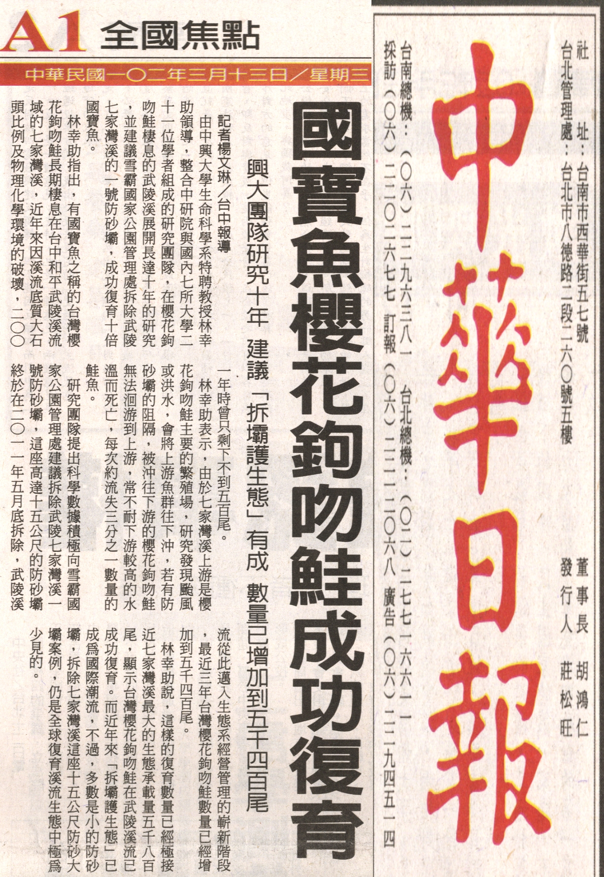 林幸助指出,有國寶魚之稱的台灣櫻花鉤吻鮭長期棲息在台中和平武陵溪流域的七家灣溪,近年來因溪流底質大石頭比例及物理化學環境的破壞,二○○一年時曾只剩下不到五百尾。