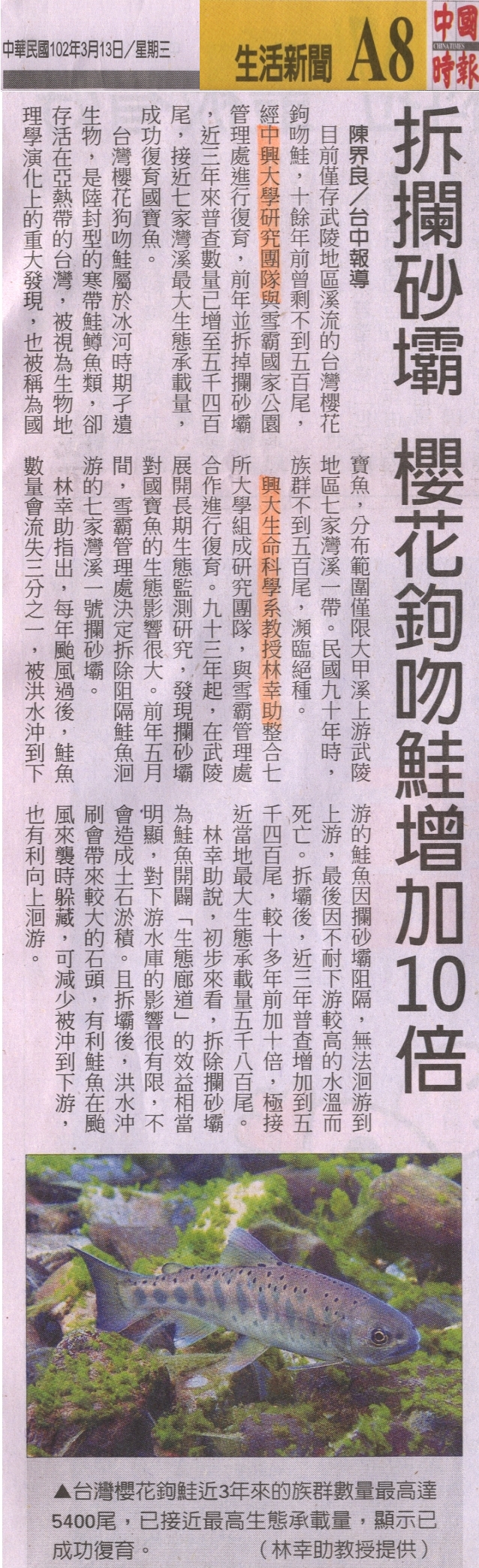 興大生命科學系教授林幸助整合七所大學組成研究團隊,與雪霸管理處合作進行復育。九十三年起,在武陵展開長期生態監測研究,發現攔砂壩對國寶魚的生態影響很大。前年五月間,雪霸管理處決定拆除阻隔鮭魚洄游的七家灣溪一號攔砂壩。