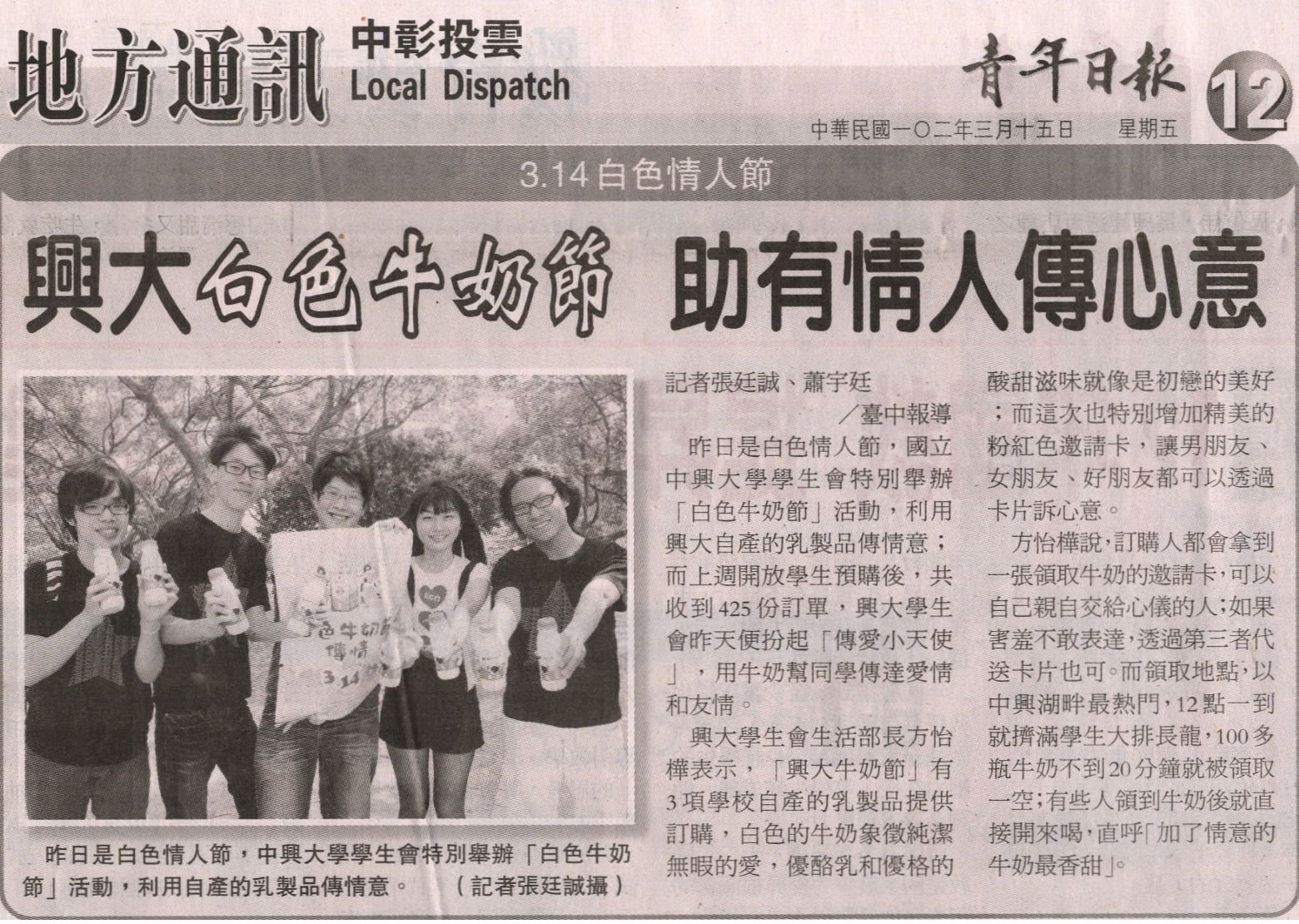 昨日是白色情人節,國立中興大學學生會特別舉辦「白色牛奶節」活動,利用興大自產的乳製品傳情意;而上週開放學生預購後,共收到425份訂單,興大學生會昨天便扮起「傳愛小天使」,用牛奶幫同學傳達愛情和友情。