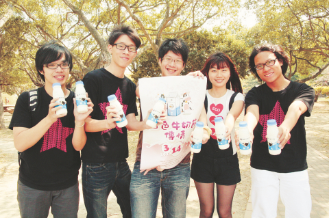 昨日是白色情人節,中興大學學生會特別舉辦「白色牛奶節」活動,利用自產的乳製品傳情意。(記者張廷誠攝) |
