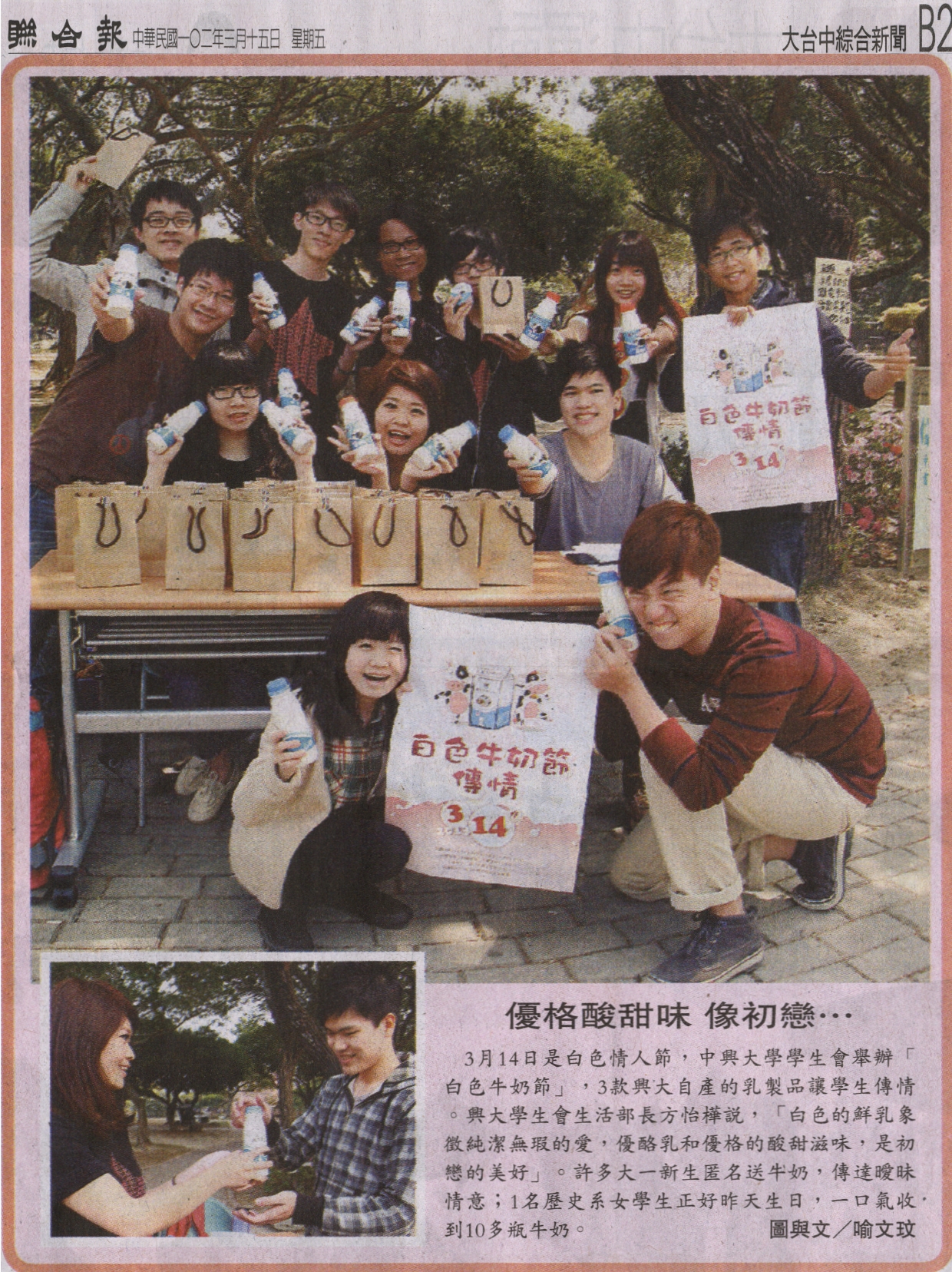 3月14日是白色情人節,中興大學學生會舉辦「白色牛奶節」,3款興大自產的乳製品讓學生傳情。興大學生會生活部長方怡樺說,「白色的鮮乳象徵純潔無瑕的愛,優酪乳和優格的酸甜滋味,是初戀的美好」。許多大一新生匿名送牛奶,傳達曖昧情意;1名歷史系女學生正好昨天生日,一口氣收到10多瓶牛奶。
