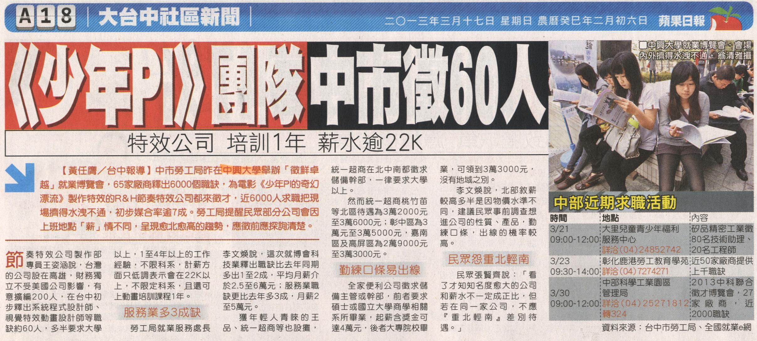 節奏特效公司製作部專員王姿涵說,台灣的公司設在高雄,財務獨立不受美國公司影響,有意擴編200人,在台中初步釋出系統程式設計師、視覺特效動畫設計師等職缺約60人,多半要求大學以上,1至4年以上的工作經驗,不限科系,計薪方面只低調表示會在22K以上,不限定科系,且還可上動畫培訓課程1年。