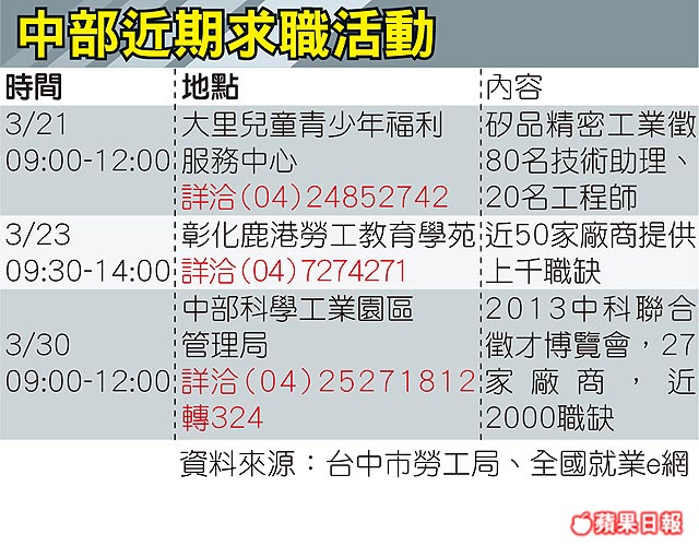 中市勞工局昨在中興大學舉辦「徵鮮卓越」就業博覽會,65家廠商釋出6000個職缺,為電影《少年PI的奇幻漂流》製作特效的R&H節奏特效公司都來徵才,近6000人求職把現場擠得水洩不通,初步媒合率逾7成。勞工局提醒民眾部分公司會因上班地點「薪」情不同,呈現愈北愈高的趨勢,應徵前應探詢清楚。