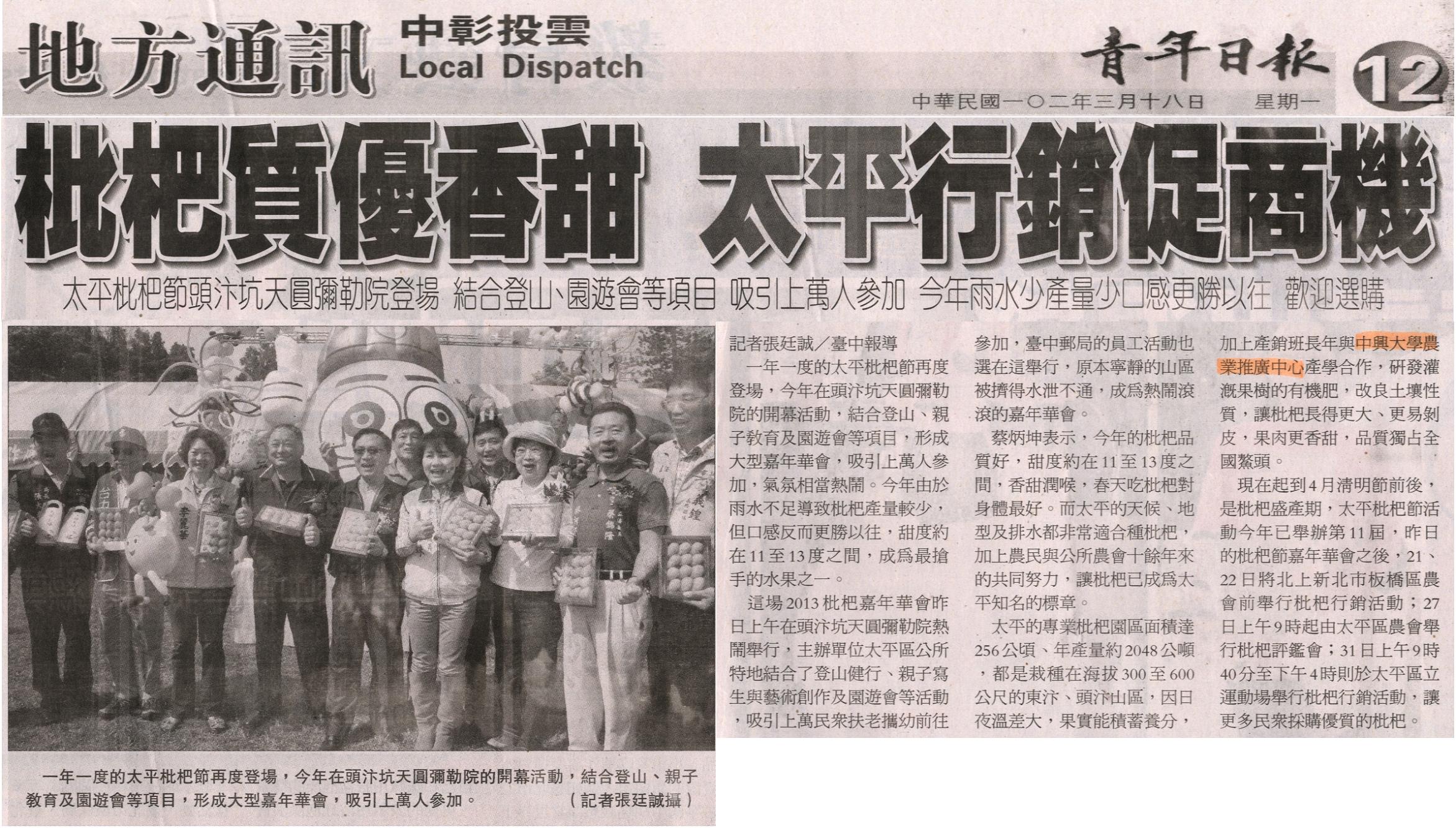 現在起到4月清明節前後,是枇杷盛產期,太平枇杷節活動今年已舉辦第11屆,昨日的枇杷節嘉年華會之後,21、22日將北上新北市板橋區農會前舉行枇杷行銷活動;27日上午9時起由太平區農會舉行枇杷評鑑會;31日上午9時40分至下午4時則於太平區立運動場舉行枇杷行銷活動,讓更多民眾採購優質的枇杷。