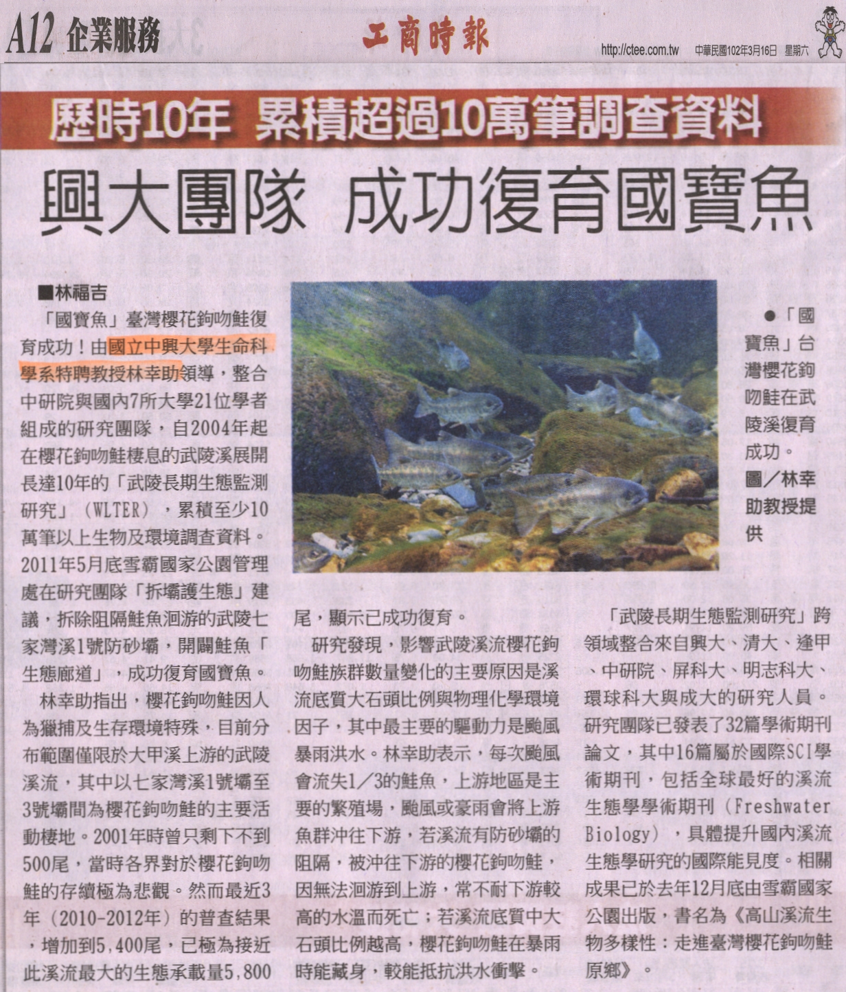 「國寶魚」臺灣櫻花鉤吻鮭復育成功!由國立中興大學生命科學系特聘教授林幸助領導,整合中研院與國內7所大學21位學者組成的研究團隊,自2004年起在櫻花鉤吻鮭棲息的武陵溪展開長達10年的「武陵長期生態監測研究」(WLTER),累積至少10萬筆以上生物及環境調查資料。2011年5月底雪霸國家公園管理處在研究團隊「拆壩護生態」建議,拆除阻隔鮭魚洄游的武陵七家灣溪1號防砂壩,開闢鮭魚「生態廊道」,成功復育國寶魚。