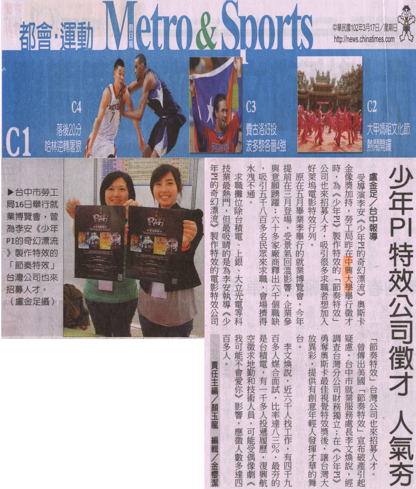 受導演李安《少年PI的奇幻漂流》奧斯卡金像獎加持,勞工局昨在中興大學舉行徵才時,為《少年PI》製作特效的「節奏特效」公司也來招募人才,吸引很多求職者想加入好萊塢電影特效行列。