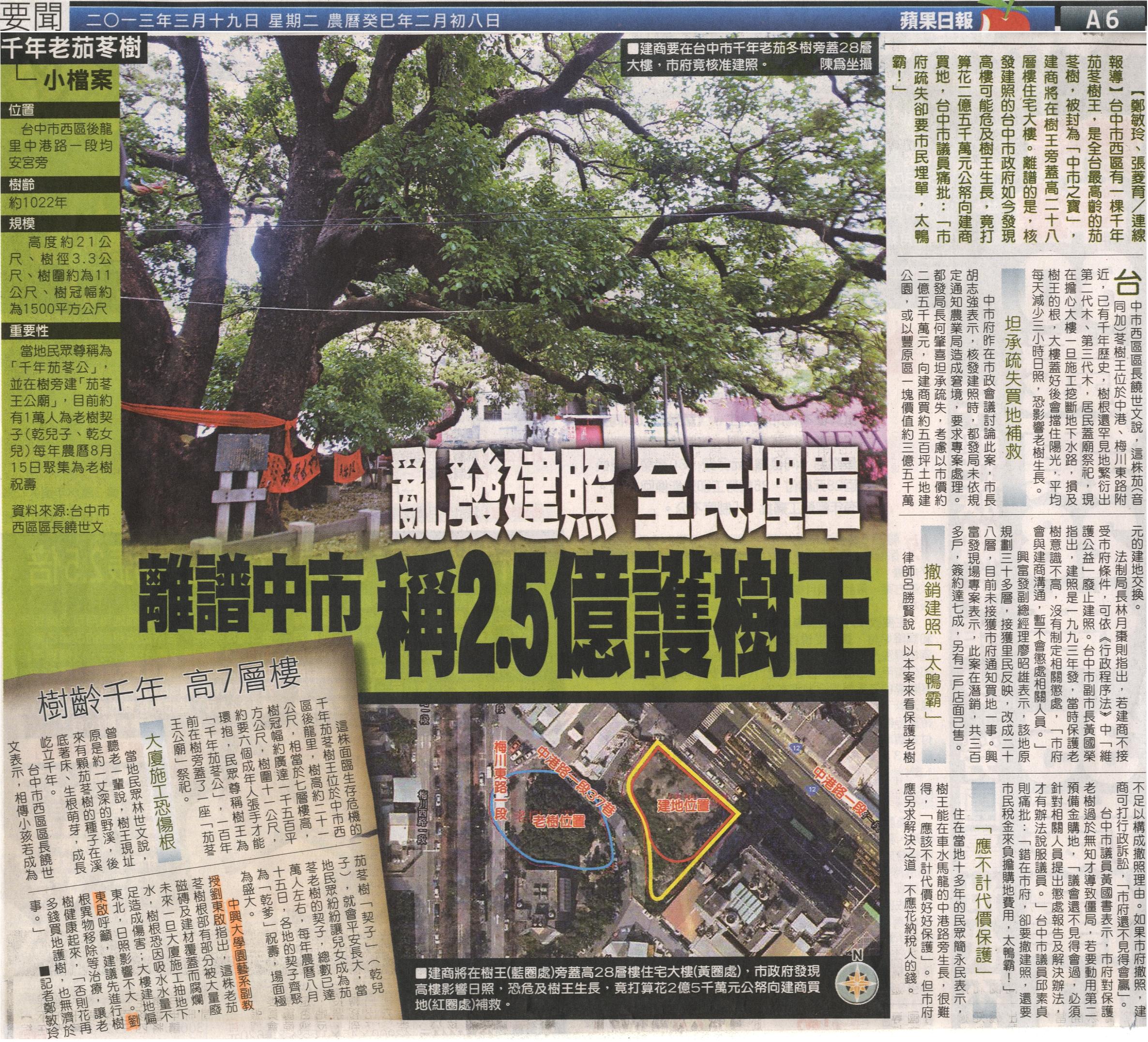 大廈施工恐傷根 當地民眾林世文說,曾聽老一輩說,樹王現址原是約一丈深的野溪,後來有顆茄苳樹的種子在溪底著床、生根萌芽,成長屹立千年。