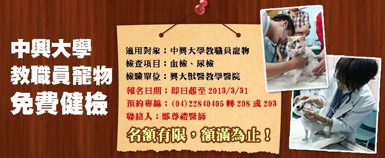 各位中興大學的教職員工們您好,教學醫院自今年起與Idexx公司進行產學合作,將免費提供臨床病理學生實習之全套檢測套組(血液學、生化學、尿液學及免疫學)。為有效利用此產學合作資源,促進學生學習並回饋學校,特結合學生實習,提供每位教職員一寵物免費血檢及尿檢之機會,歡迎教職員向教學醫院檢驗科鄭尊禮醫師登記預約,期限至2013/3/31,名額有限,額滿為止。【電話預約為優先】