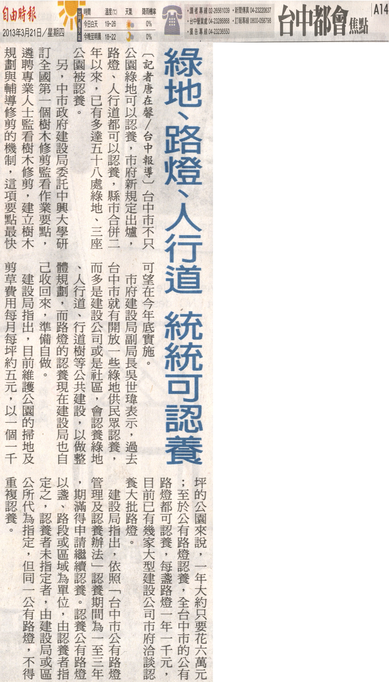 建設局指出,目前維護公園的掃地及剪草費用每月每坪約五元,以一個一千坪的公園來說,一年大約只要花六萬元;至於公有路燈認養,全台中市的公有路燈都可認養,每盞路燈一年一千元,目前已有幾家大型建設公司市府洽談認養大批路燈。