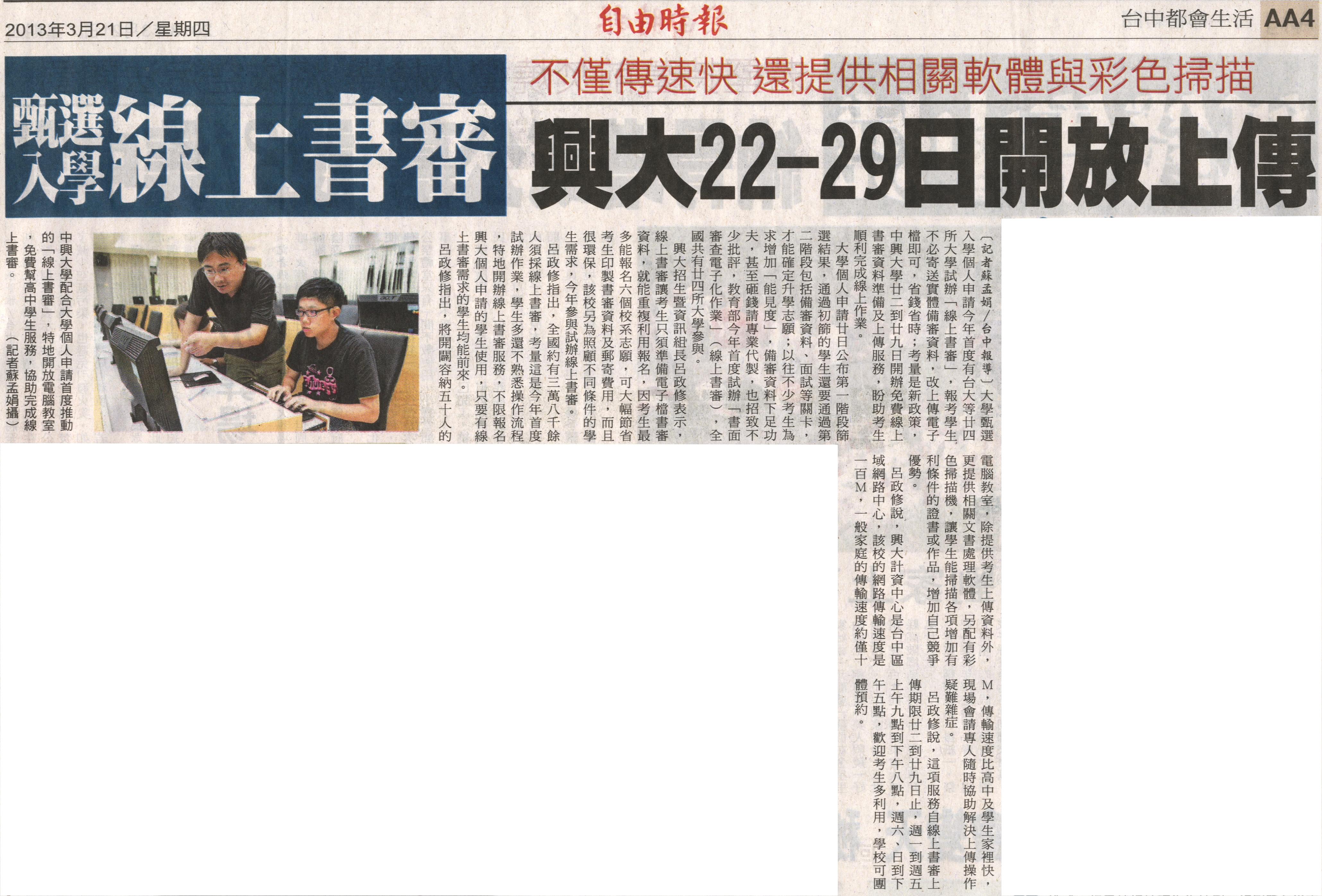 大學甄選入學個人申請今年首度有台大等廿四所大學試辦「線上書審」,報考學生不必寄送實體備審資料,改上傳電子檔即可,省錢省時;考量是新政策,中興大學廿二到廿九日開辦免費線上書審資料準備及上傳服務,盼助考生順利完成線上作業。