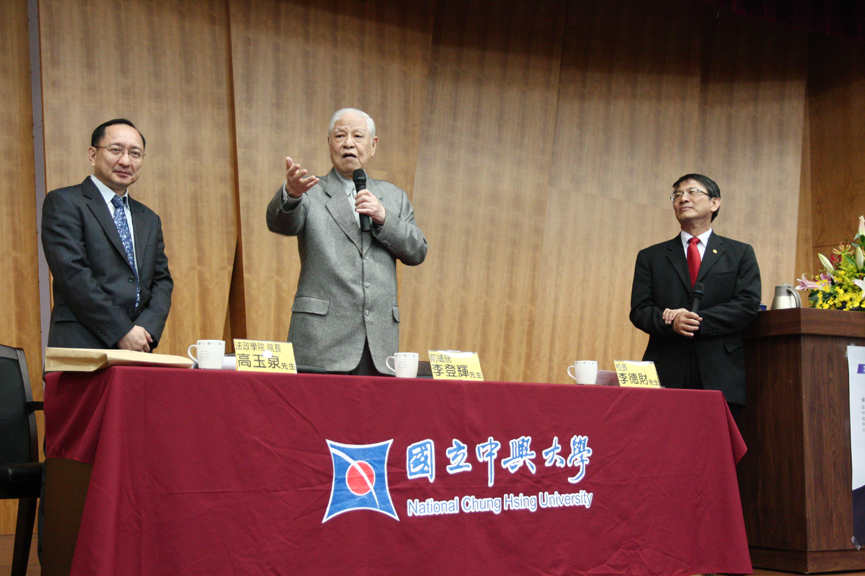 興大李德財校長致歡迎詞時表示,興大法政學院雖成立一年多,卻是國內培養法律、政治與外交人才的重要單位,為突顯該學院特色,並讓全校師生都有興趣參與,特地舉辦「興大法政論壇」。首場演講非常榮幸邀請到李前總統主講,相信未來的講座必能激起廣大迴響。李前總統是當代台灣政治與社會發展具有深刻影響力的人物,擔任總統12年期間,致力推動台灣民主化與本地化,讓台灣徹底擺脫威權時代,成為真正的民主國家。今天在台灣,不同的人基於各種意識型態或政治立場,對李總統的政績有各種不同的評價,但不同意見的表達正是台灣多元社會與民主的表現,也是李前總統對台灣最大的貢獻,相對於中國大陸,這也是台灣最大的資產。