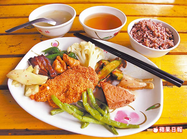 ◎餐點內容:自助餐式,有豬、雞、魚、青菜等共40多樣菜色,秤重計價