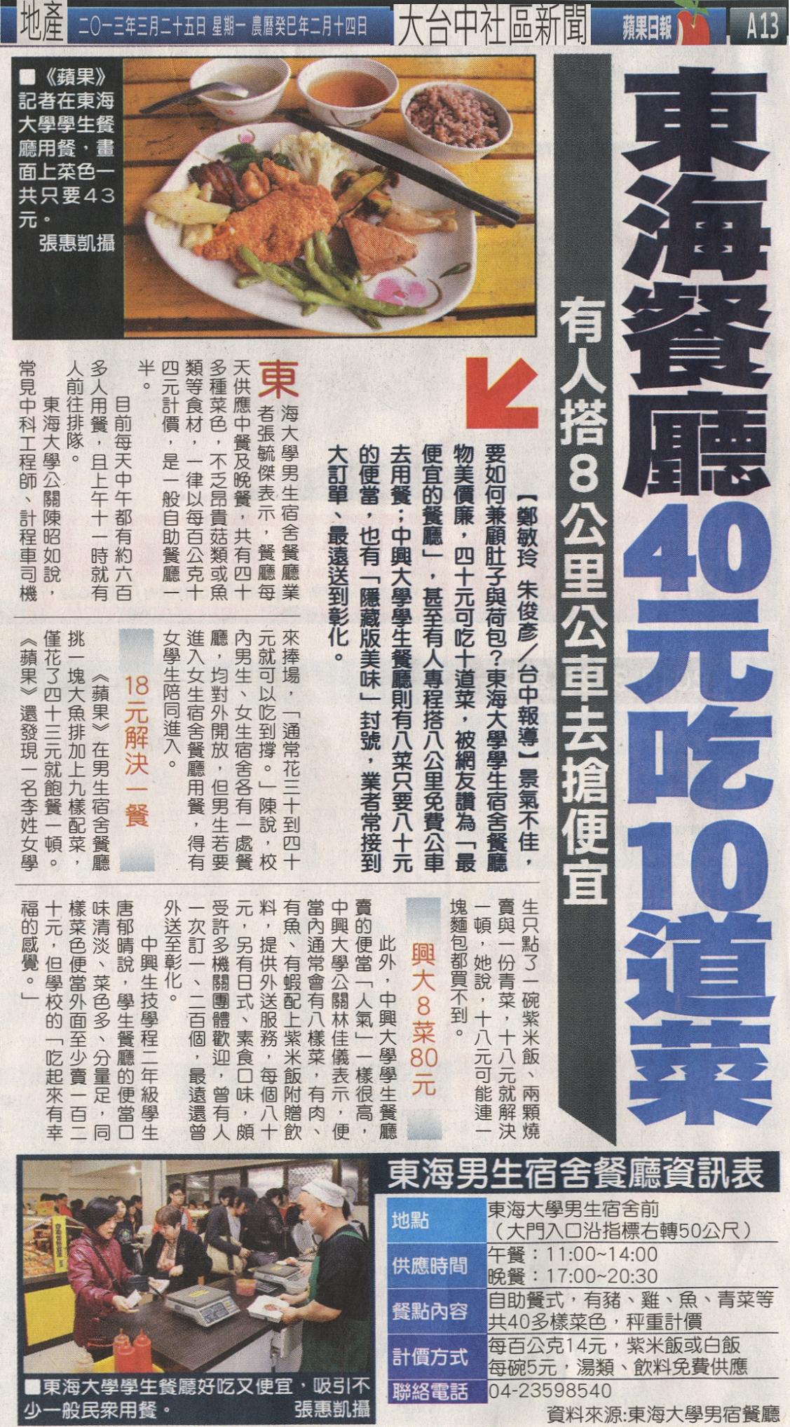 東海大學公關陳昭如說,常見中科工程師、計程車司機來捧場,「通常花三十到四十元就可以吃到撐。」陳說,校內男生、女生宿舍各有一處餐廳,均對外開放,但男生若要進入女生宿舍餐廳用餐,得有女學生陪同進入。