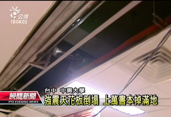 這一場地震也讓中部不少校園受到影響,還有部分校舍毀損,包括中興大學圖書館的天花板倒塌,上萬本書籍也散落一地,校方緊急宣布從中午開始,夜間部停班停課。另外在各家國家而地震當時,還有國小正在上課,老師也趕緊疏散小朋友到操場避難。