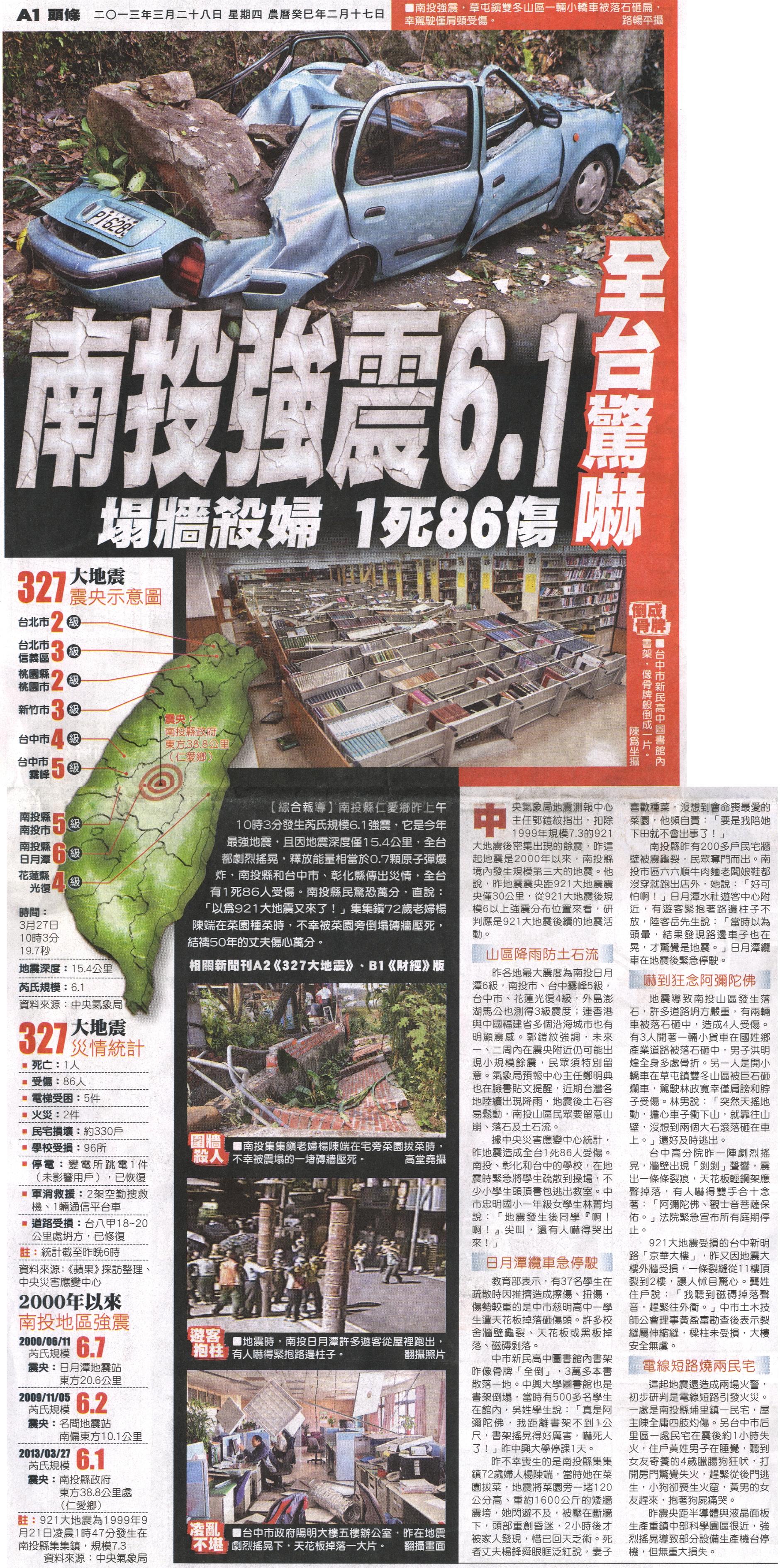 ●2013/03/27 芮氏規模:6.1 震央:南投縣政府東方38.8公里處(仁愛鄉)