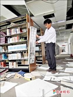 中興大學圖書館天花板、風管、燈具和書架掉落,滿目瘡痍。(記者蔡淑媛攝) |
