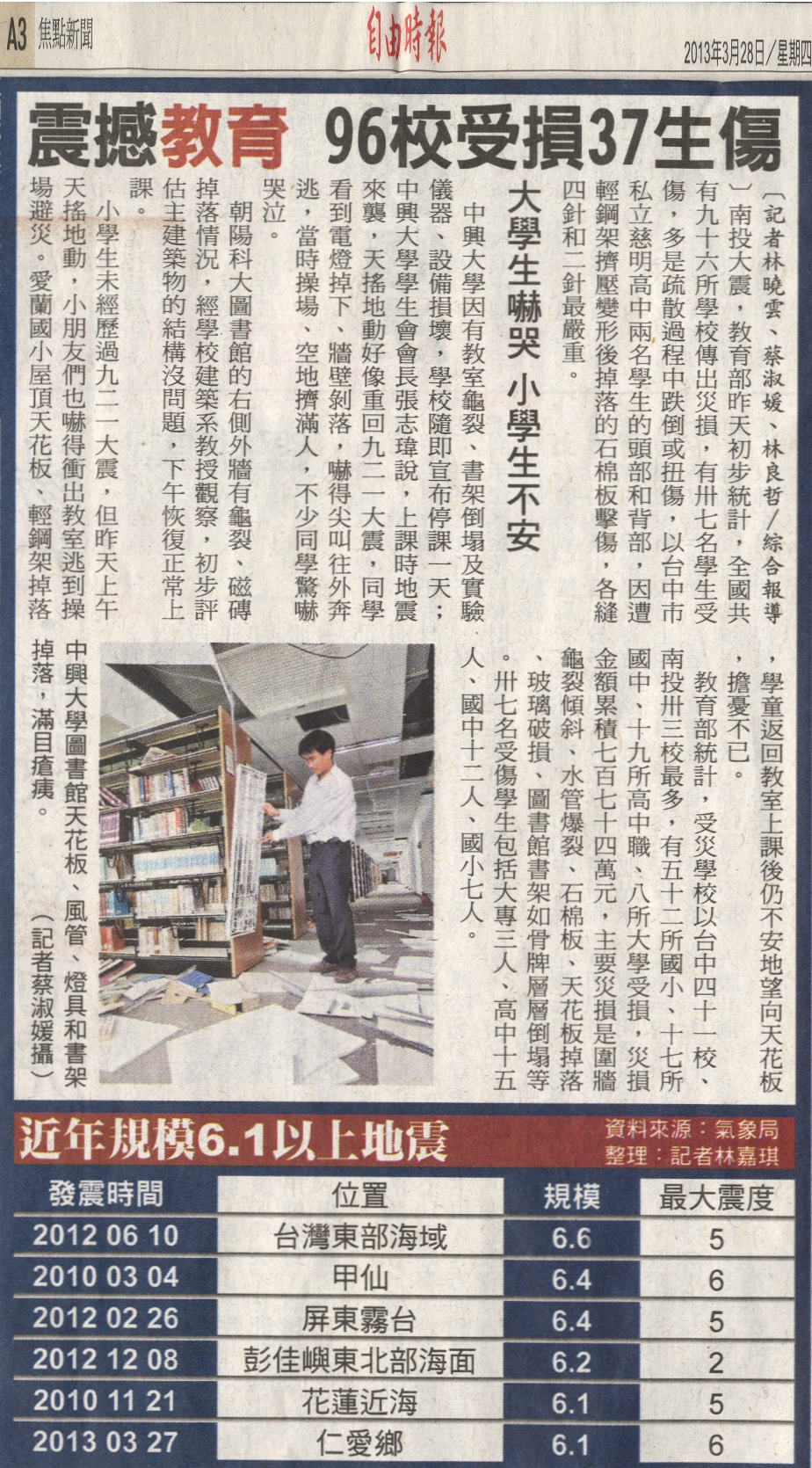 中興大學因有教室龜裂、書架倒塌及實驗儀器、設備損壞,學校隨即宣布停課一天;中興大學學生會會長張志瑋說,上課時地震來襲,天搖地動好像重回九二一大震,同學看到電燈掉下、牆壁剝落,嚇得尖叫往外奔逃,當時操場、空地擠滿人,不少同學驚嚇哭泣。