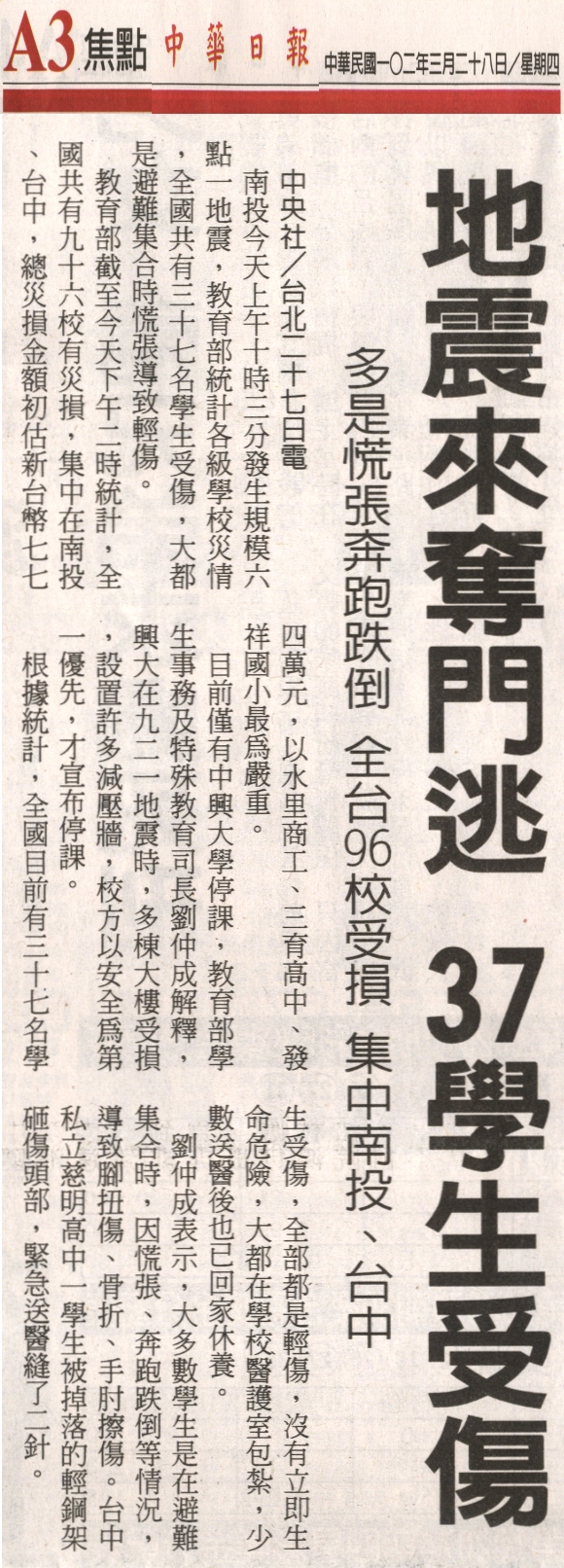 南投今天上午十時三分發生規模六點一地震,教育部統計各級學校災情,全國共有三十七名學生受傷,大都是避難集合時慌張導致輕傷。