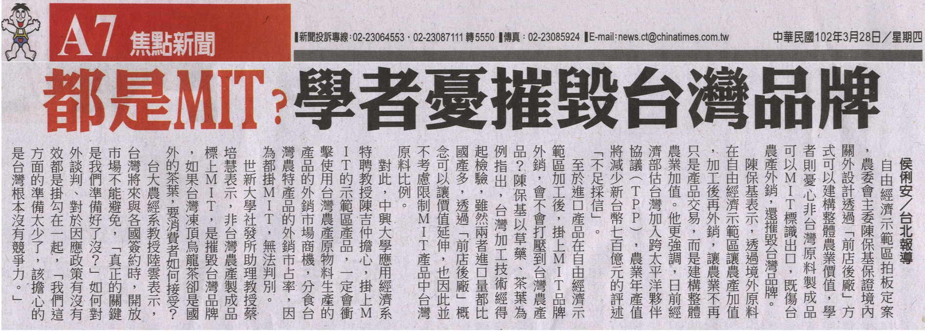 世新大學社發所助理教授蔡培慧表示,非台灣農產製成品標上MIT,是摧毀台灣品牌,如果台灣凍頂烏龍茶卻是國外的茶葉,要消費者如何接受?